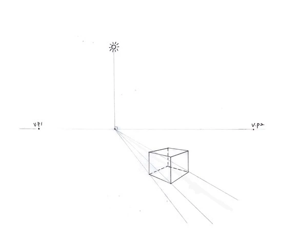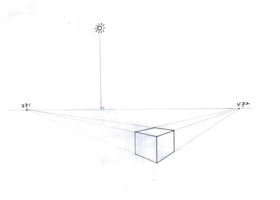 적당한 높이에 해를 두고 두 소실점이 있는 눈높이선에 수직선을 그어 서로 만나는 곳이 그림자의 소실점이에요.