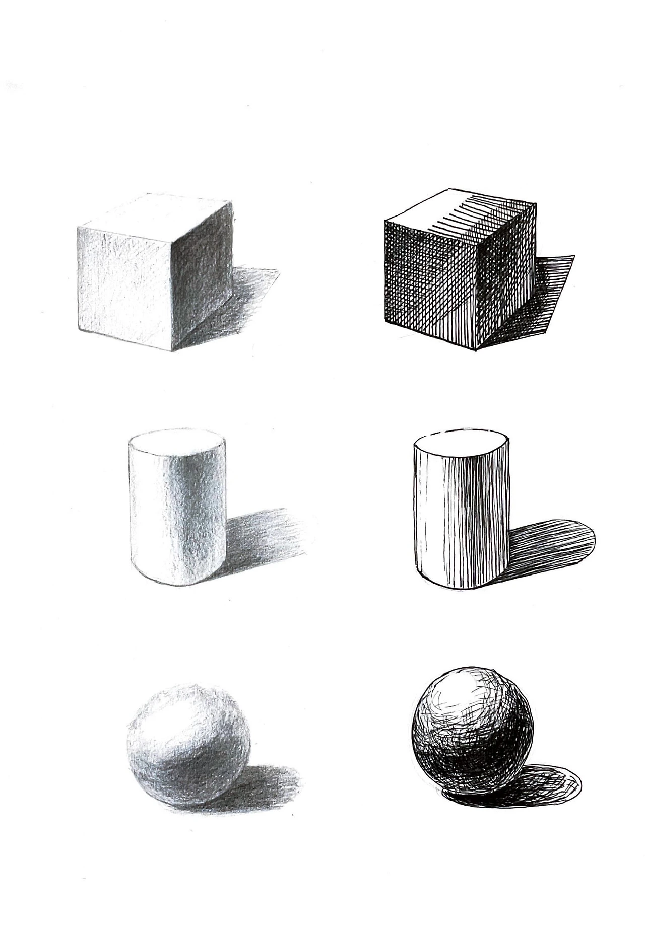 그러데이션에서 소개한 해칭 중 사각형은 크로스 해칭으로, 원기둥은 일반 해칭으로, 동그라미는 굴곡 있는 선끼리 엮은 해칭으로 표현했어요.