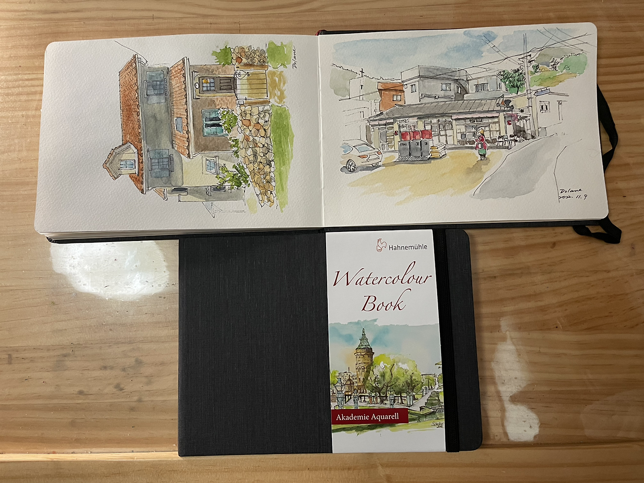 평당 무게가 200g에 중목(cold pressed)인데, 가벼운 수채화가 가능해서 어반스케치용으로 딱이죠.