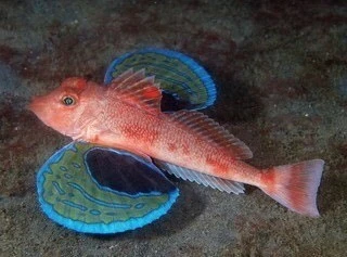 A : 성대(ホウボウ)입니다. 선명한 빨간색 몸통에 화려한 얼룩무늬의 커다란 가슴지느러미가 특징입니다. 미끼를 찾을 때 바다 밑을 기는 듯이 움직여 '기는 생선(ほう魚)'이 이름의 유래입니다. 이 계절의 맛이 최고입니다.