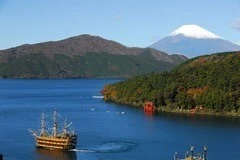 안개가 자욱하게 낀 아시 호수(芦ノ湖)와 오른쪽에 고마가타케(駒ケ岳), 왼쪽엔 눈 덮인 후지산, 호숫가엔 하코네 신사(箱根神社)가 있다. 새싹이 움트기 시작해, 차츰 봄다워진 '방긋 웃는 산'을 표현하고 있다.