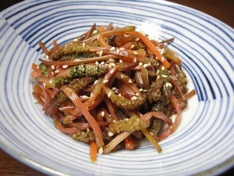 A : 뱀밥(土筆 츠쿠시)입니다. 어원은, 땅속에서 쑥 내밀고 나와서 '쑥쑥이(츠쿠즈쿠시)' '츠쿠츠쿠시(突津串)'에서 왔습니다. 그 모양이 붓과 아주 많이 닮아서, '토필(土筆)'이라는 한자가 되었습니다. 조림이나 무침으로 제철 맛을 냅니다.