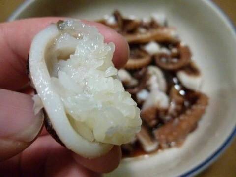 A : 주꾸미(飯蛸)입니다. 익히면 5cm 정도 되는 작은 문어입니다. 겨울에서 봄 동안이 산란기 철인데, 머리 부분에 5mm 정도의 알들을 빽빽이 저장합니다. 이 알이 쌀알 같은 모양이라서 이름이 '飯蛸(밥 문어)'가 되었습니다.