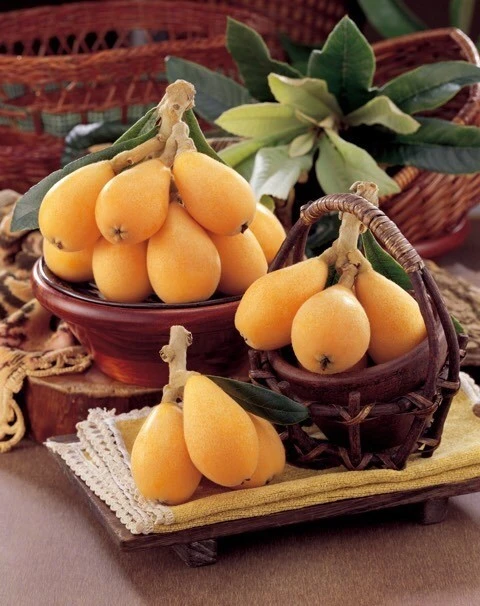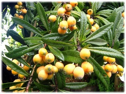 A : 비파입니다. 열매 모양이 악기 비파와 닮아 있어 그 이름이 되었습니다. 비파나무는 대약왕수(大薬王樹)라고 부르는데, 잎을 건조시켜 달인 비파차는 면역력을 높이는 효과도 있습니다. 제철은 5~7월 초순 경입니다.