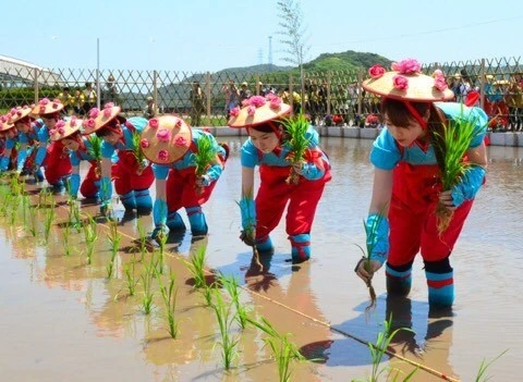 옛날 모내기는 농가의 큰 행사였습니다. 단순한 농사일이 아니라, 논의 신을 영접하는 제사라는 의미도 있었습니다. 예전에는 엉거주춤한 자세로 진흙에 잠겨 모를 한 단 한 단 심는 중노동이었습니다. 지금도 지방에 따라, 꽃삿갓을 쓴 '아가씨(早乙女)'가 모내기를 하는 풍습이 남아 있습니다.