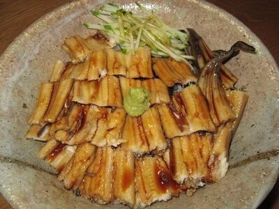 A : 붕장어(穴子 아나고)입니다. 일반적으로 간토(関東)에서는 쪄서 먹고, 간서(関西)에서는 구워 먹습니다. 붕장어는 장어와 마찬가지로 영양가가 높고, 비타민 A와 미네랄, DHA가 풍부해 여름에 빼놓을 수 없는 자양식 재료의 하나입니다.