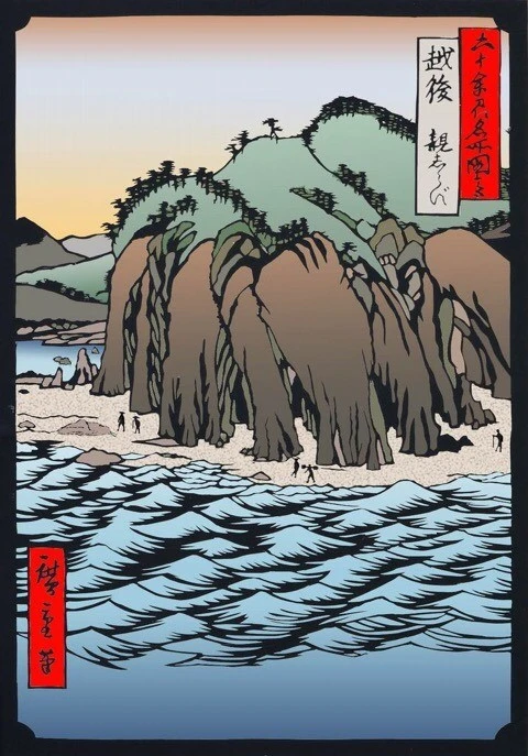 호쿠리쿠도(北陸道)에서 최대로 험했던 오야시라즈 코시라즈(親不知子不知). 쫓아오는 동장군도, 이 벼랑도 거센 파도도, 거역할 수 없는 자연의 위력을 이야기한다.