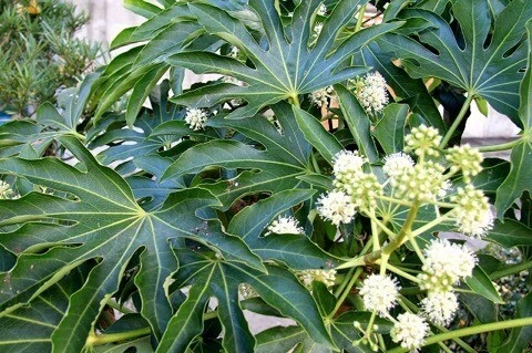 A : 팔손이나무입니다. 커다란 손바닥과 닮은 잎의 끝이 여덟 개 안팎으로 나뉘어 있어, 재수 좋은 '8'이라 꼽습니다. 에도시대부터 액막이로써 뜰에 심었습니다. 이 계절에 꽃을 피웁니다.