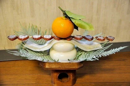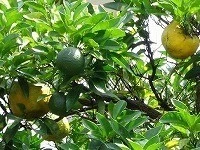 A : 다이다이(橙 등자나무)입니다. 노랗게 익어도 따지 않으면 도로 파래져 가을에 다시 노래지는 신기한 감귤류입니다. '다이다이(代々 대대)'로 열매를 맺는다고 해서 이 이름이 되었습니다. 날로는 먹을 수 없지만, 기원물인 카가미 모치(鏡餅)나 정월 장식물에 쓰입니다.