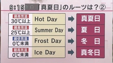 또한, '후유비(冬日)'는 하루 최저기온이 0도 미만인 날을, '마후유비(真冬日)'는 최고 기온이 0도 미만인 날을 말합니다.