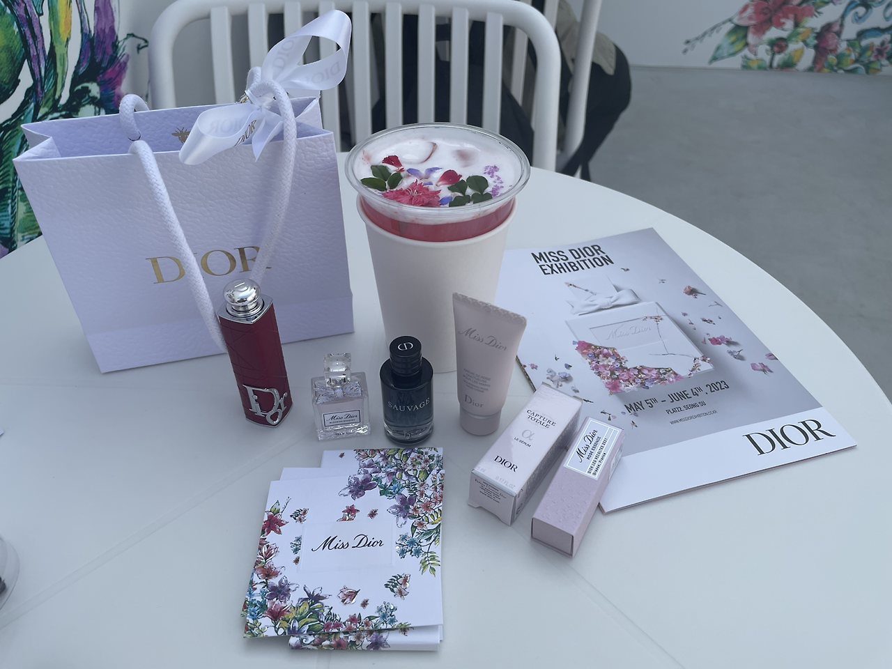 이곳에서 사려고 찜했던 립스틱 케이스와 리필을 구매하고선 꽃이 담긴 에이드를 마시자니 공쥬가 된 듯했다...ㅎㅎㅎ 사은품들도 어찌나 알찬지!!! 미스 디올의 '블루밍 부케'는 내가 오래전부터 애정하던 향수로 뉴욕 여행에서도 사 왔었다. 퇴근해 온 남편한테 조니 뎁이 모델인 '소바쥬' 향수를 발라주니 싫어하지 않았다. 과하지 않은 은은한 향수가 필요한 나이가 되긴 했다...ㅠㅠ