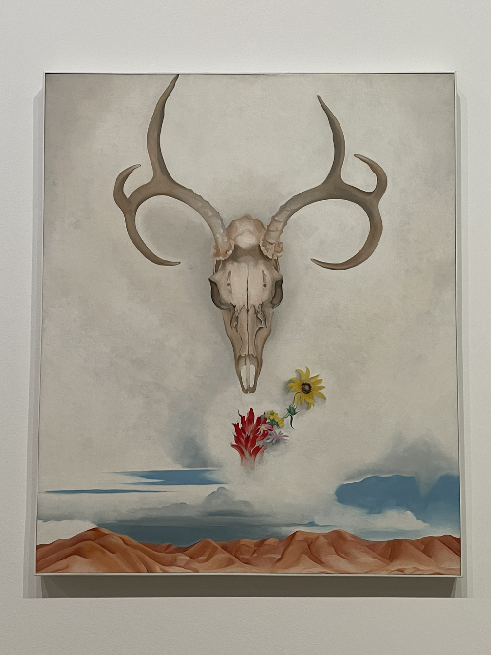 크고 빨간 꽃으로 기억되는 조지아 오키프의 또 다른 작품에 눈길이 갔다. 사막 위에 높이 떠있는 사슴의 머리뼈와 야생화라... 현실적인 풍경에 정물 요소가 함께 있어 오묘함으로 다가왔다.