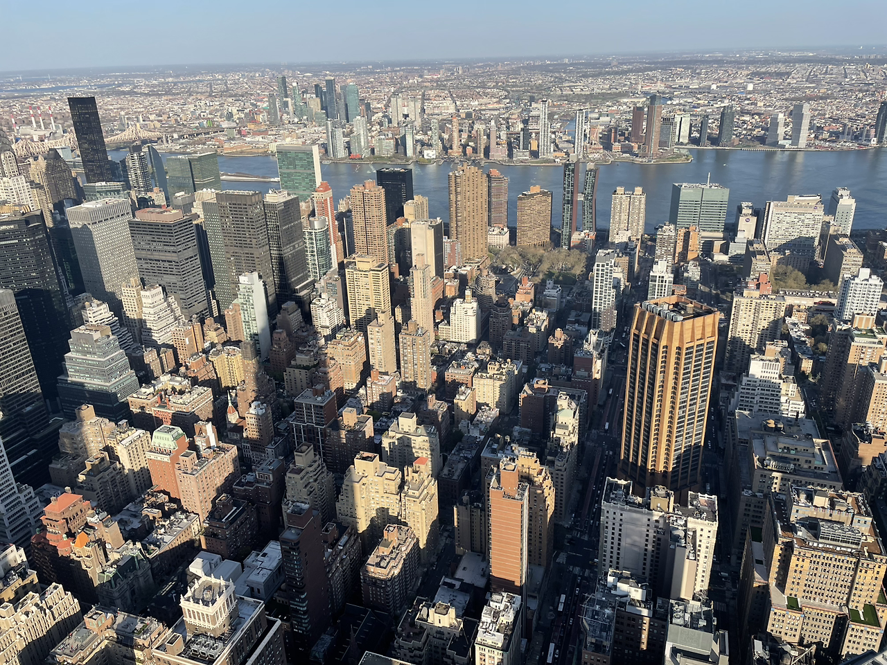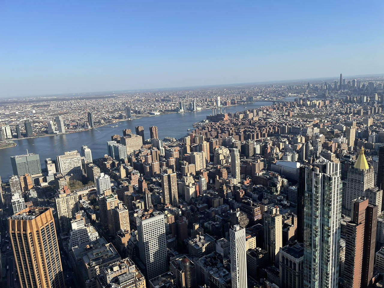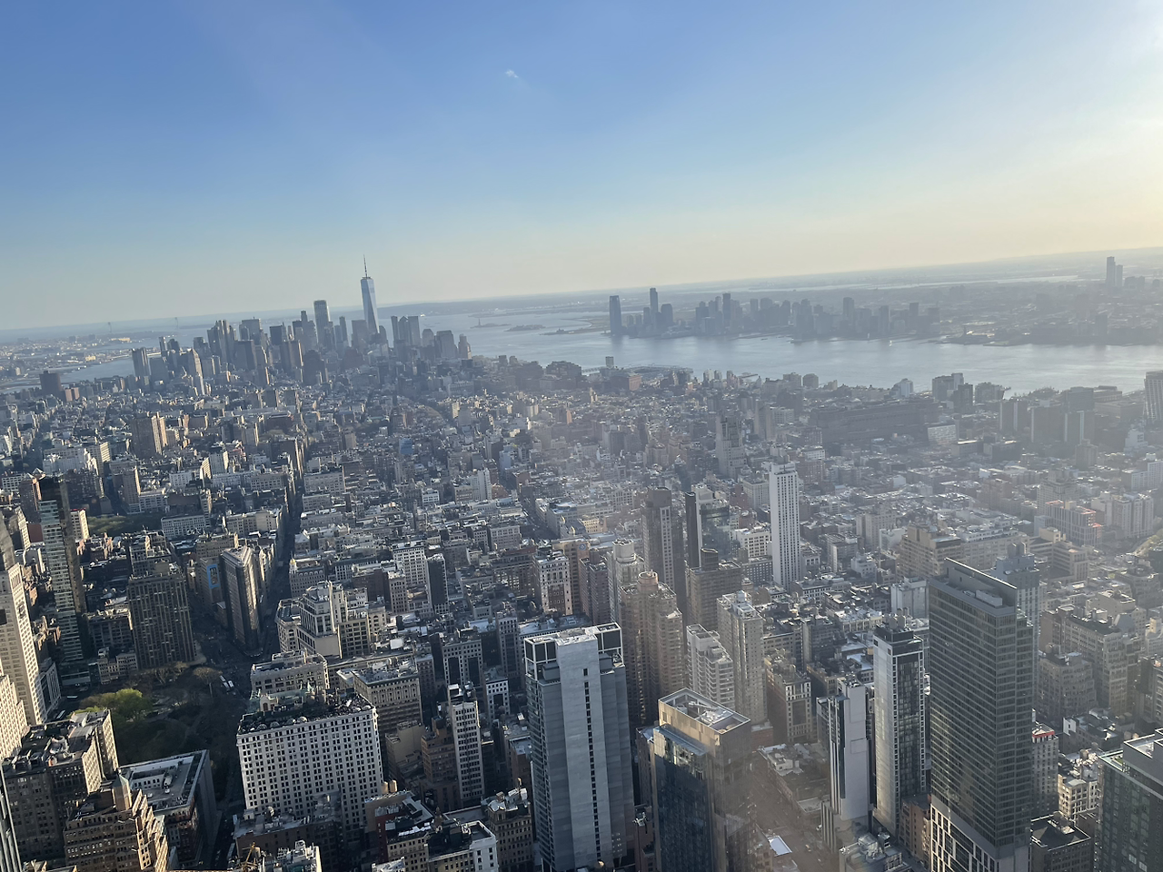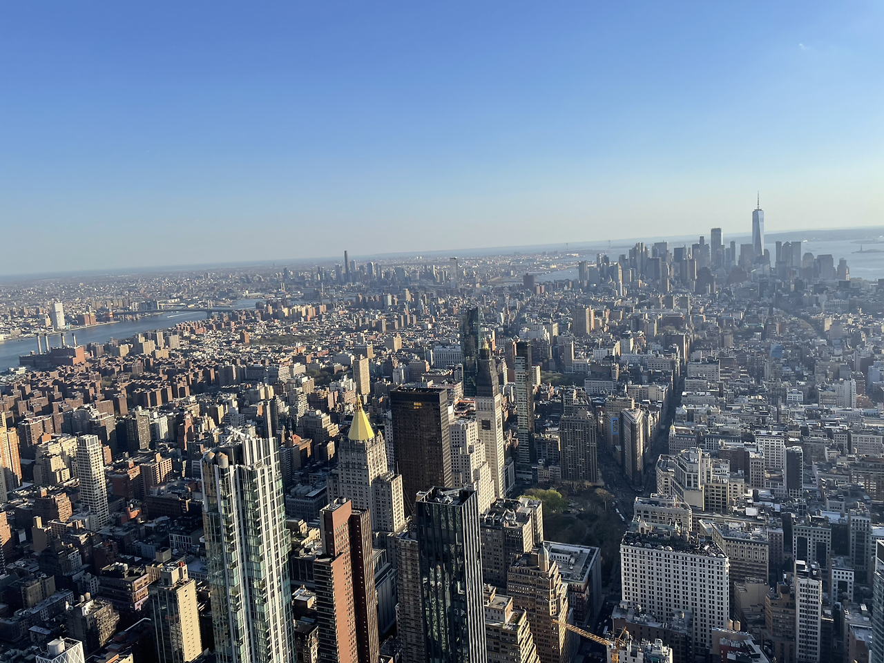 맨해튼의 단단한 암반 위치로 인해 로어 맨해튼과 미드타운에만 초고층 빌딩이 들어서 있다. 엠파이어 스테이트 빌딩 전망대의 이점이라면, 사진을 찍을 때 유리창 같은 방해 요소가 없다는 거다. 단, 손에서 핸드폰을 떨어뜨릴 위험이 있으니 특별히 조심하거나 안전선을 핸드폰과 연결하는 걸 추천한다. 기프트 숍에서 빨간색 T 셔츠를 기념으로 샀는데 날이 점점 더워져 남은 일정 동안 아주 잘 입고 다녔다.