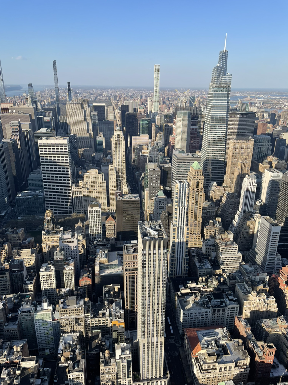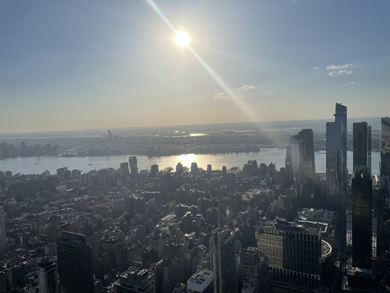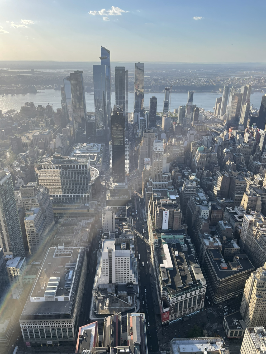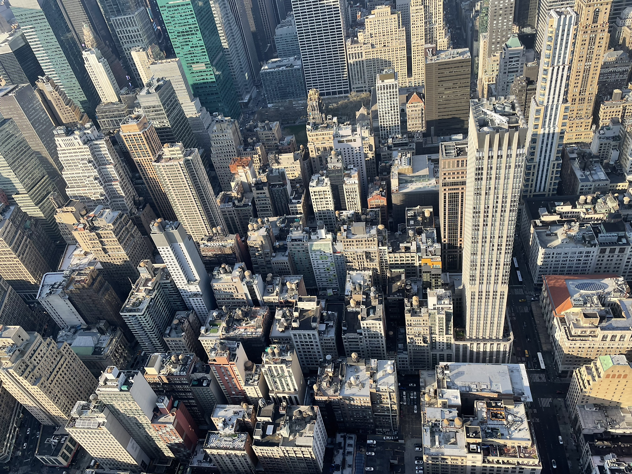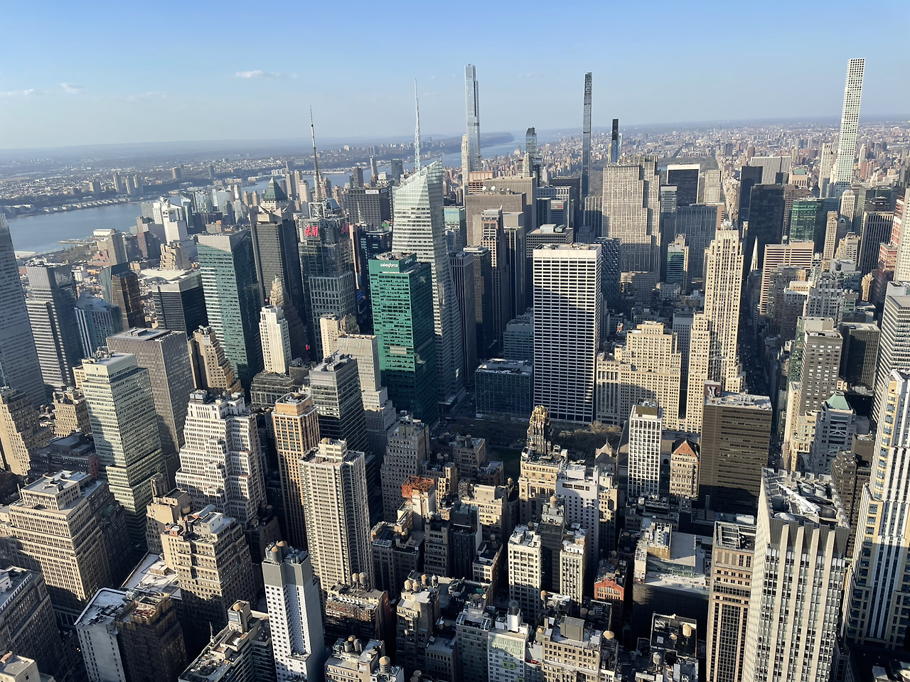 맨해튼의 단단한 암반 위치로 인해 로어 맨해튼과 미드타운에만 초고층 빌딩이 들어서 있다. 엠파이어 스테이트 빌딩 전망대의 이점이라면, 사진을 찍을 때 유리창 같은 방해 요소가 없다는 거다. 단, 손에서 핸드폰을 떨어뜨릴 위험이 있으니 특별히 조심하거나 안전선을 핸드폰과 연결하는 걸 추천한다. 기프트 숍에서 빨간색 T 셔츠를 기념으로 샀는데 날이 점점 더워져 남은 일정 동안 아주 잘 입고 다녔다.