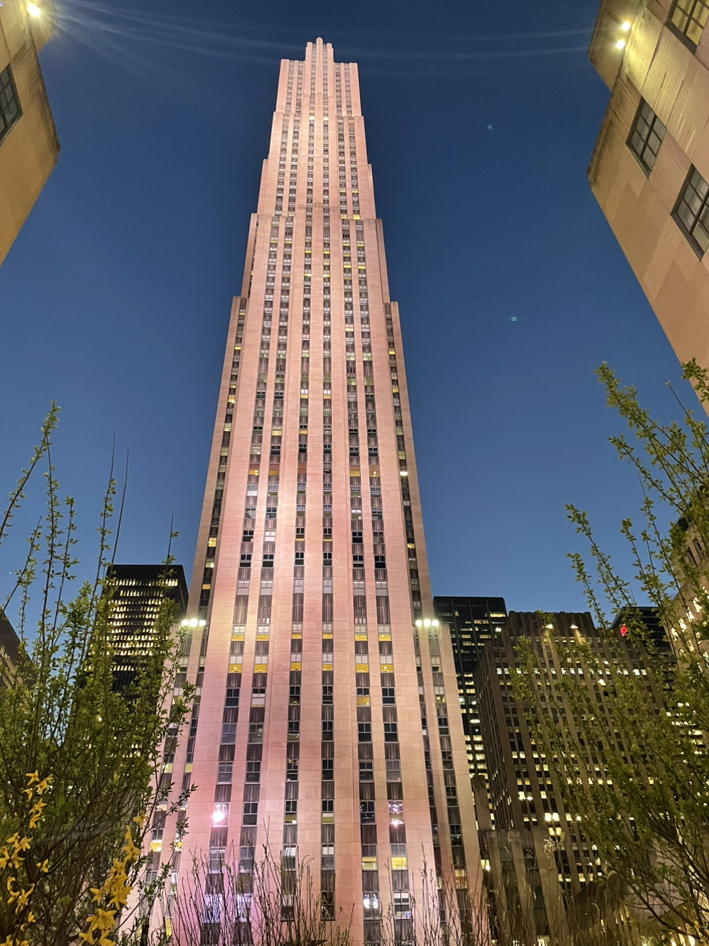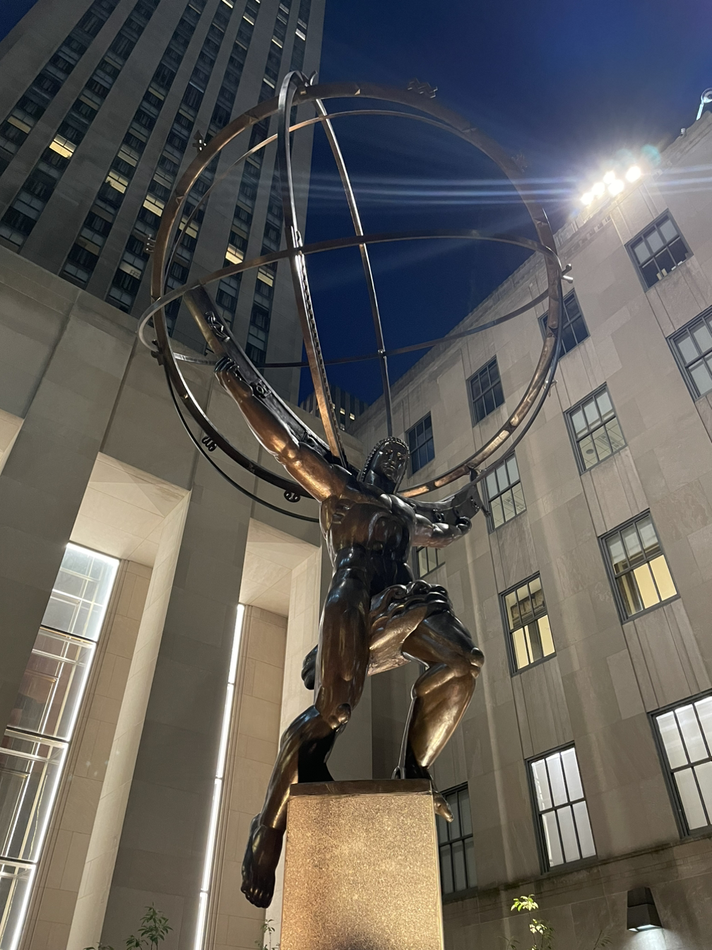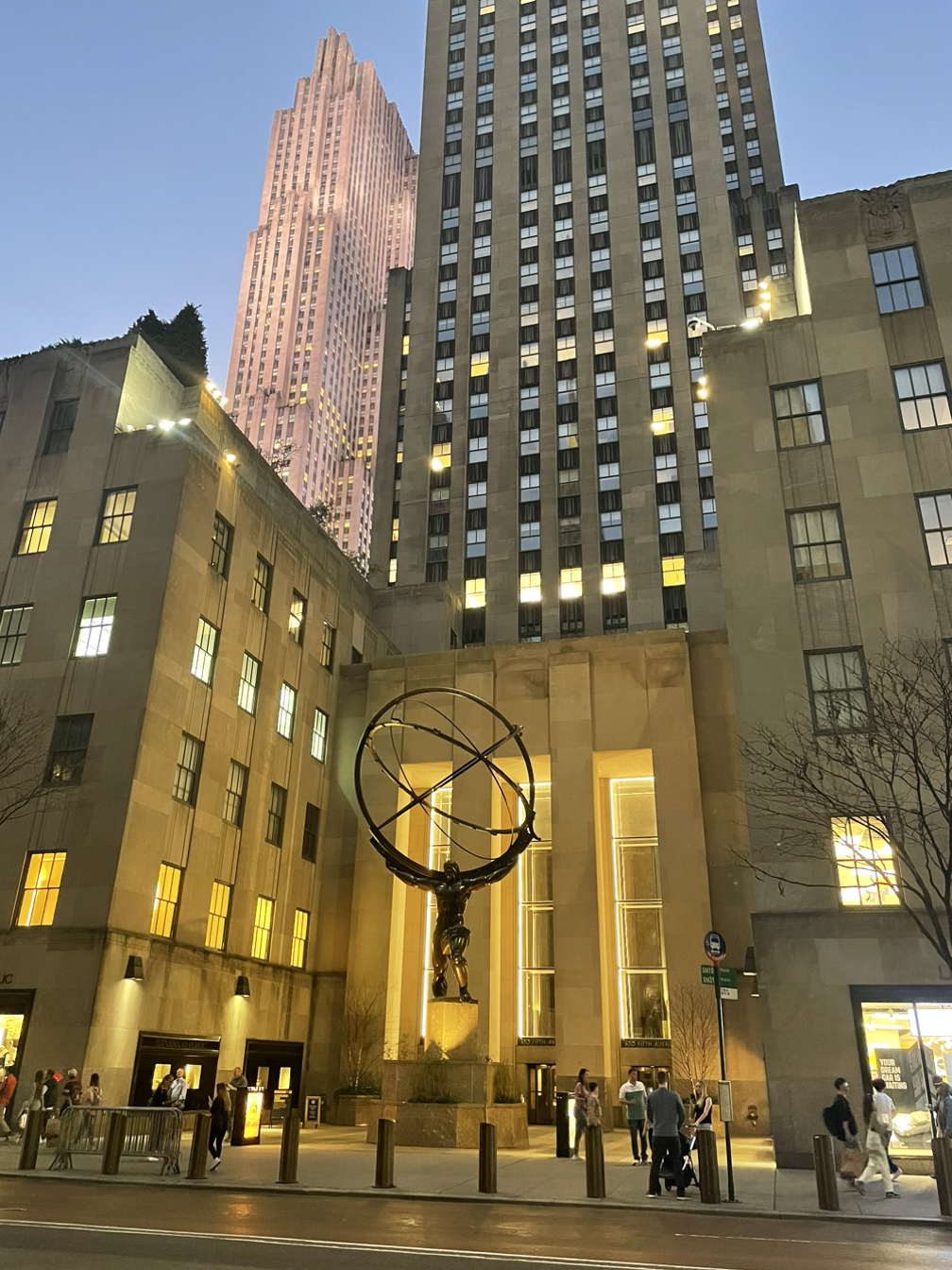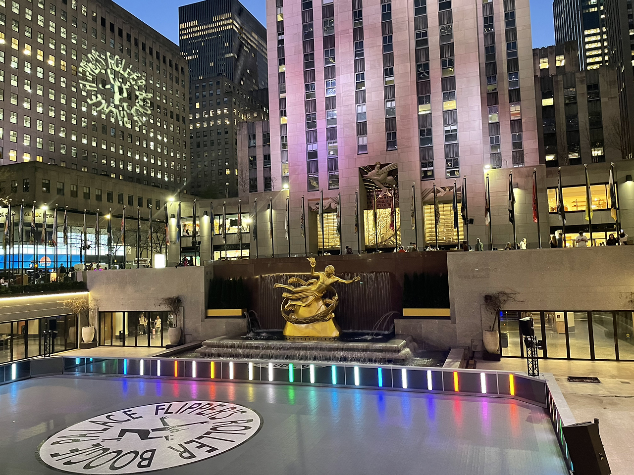 매해 12월이면 대형 크리스마스트리가 세워지고 스케이트를 탈 수 있는 곳으로도 유명한 록펠러 센터 앞으로 갔다. 펄럭이는 만국기를 배경으로 인간에게 최초로 불을 쥐여준 프로메테우스의 황금 동상이 있는데 어딘가 날아가는 모습이다. 이 건물 맨 꼭대기에 엠파이어 스테이트 빌딩보다도 더 높은 '탑 오브 더 락' 전망대가 있다. 뉴욕의 주변 야경은 엠파이어 스테이트 빌딩 전망대에서 보고, 엠파이어의 멋진 야경은 이곳에서 보면 좋을 것 같다.
