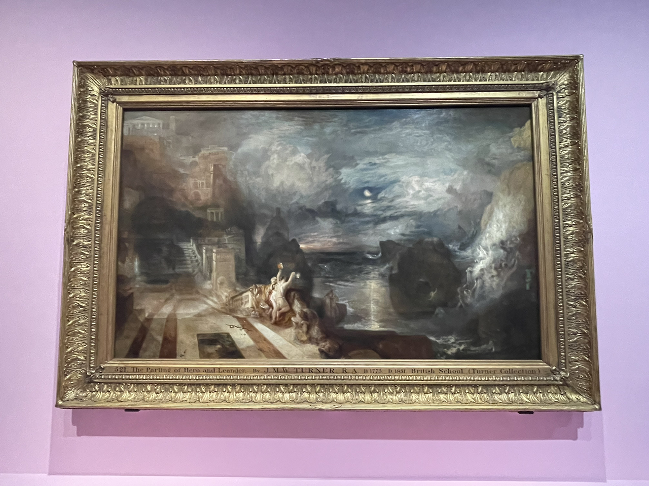 터너의 후반기 그림에 비해 중기 작품은 과연 클로드 로랭 풍의 풍경화란 생각이 들었다. 유럽과 아시아를 가르는 헬레스폰토스(현재 다르다넬스) 해협의 탑에 살았던 아프로디테의 여사제인 '헤로'는 아시아 청년 '레안드로스'와 사랑에 빠졌다. 헤로는 매일 밤 레안드로스가 물속을 헤엄쳐 올 때 그를 인도하기 위해 등불을 들고 있었다. 어느 날 밤 등불이 꺼지고 레안드로스가 익사하자 그와 함께 하기 위해 헤로는 탑에서 몸을 던진다. 후에 인상주의에 영향을 미칠 화풍의 조짐도 보인다.