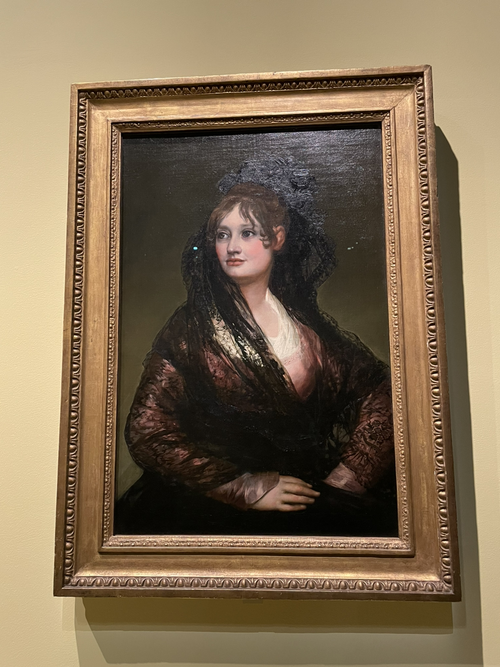 스페인의 낭만주의 화가이자 궁정화가인 고야가 그린 여인의 그림 중 내가 예쁘게 그렸다고 손꼽는 여인의 초상이다. 전형적인 스페인 복장인 흰색 셔츠와 검은색 쓰개(만틸라)를 걸친 이 젊은 여성은 스무 살에 25살이나 연상인 남자의 두 번째 부인이 되었다. 고야가 선물로 그려준 그림인데, 엑스레이로 살펴보니 어떤 남자를 그린 흔적이 나타났다. 여인의 머리 부분을 유심히 보니 쓰개 위에 머리를 붙인 듯한 이질감이 들어 신기했다.