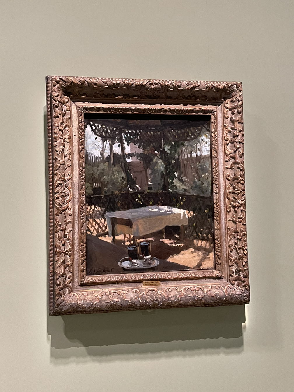 사전트가 파리 유학 시절 인상주의로부터 영향을 받은 그림이다. 제목은 앞에 있는 두 개의 와인잔이지만 눈길은 탁자 위 햇빛으로 간다. 가까이에서 보면 그저 흰색의 유화물감을 덧칠한 건데 멀찍이서 보면 영락없는 빛나는 햇살 아래 그늘진 탁자 그림이다. 뉴욕 매트로폴리탄에서 사전트의 대표작인 <마담 X>를 못 보고 온 게 정말 한이다...ㅠㅠ