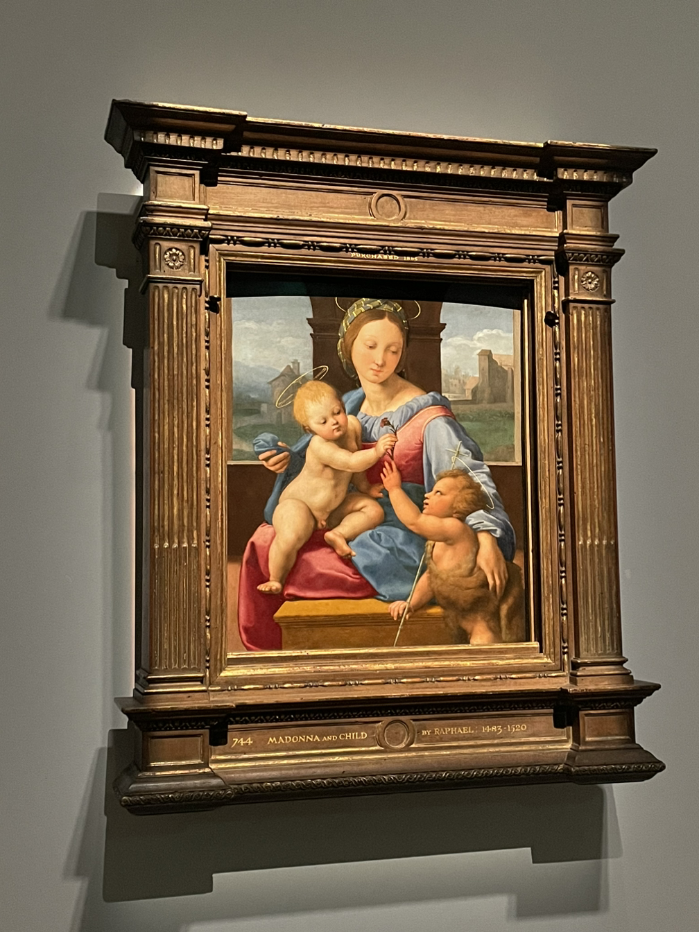 라파엘은 가장 안정적인 삼각형 구도 속에 자애로운 성모 마리아와 어린 예수 그리고 예수의 사촌 형인 세례자 요한을 많이 그렸다.