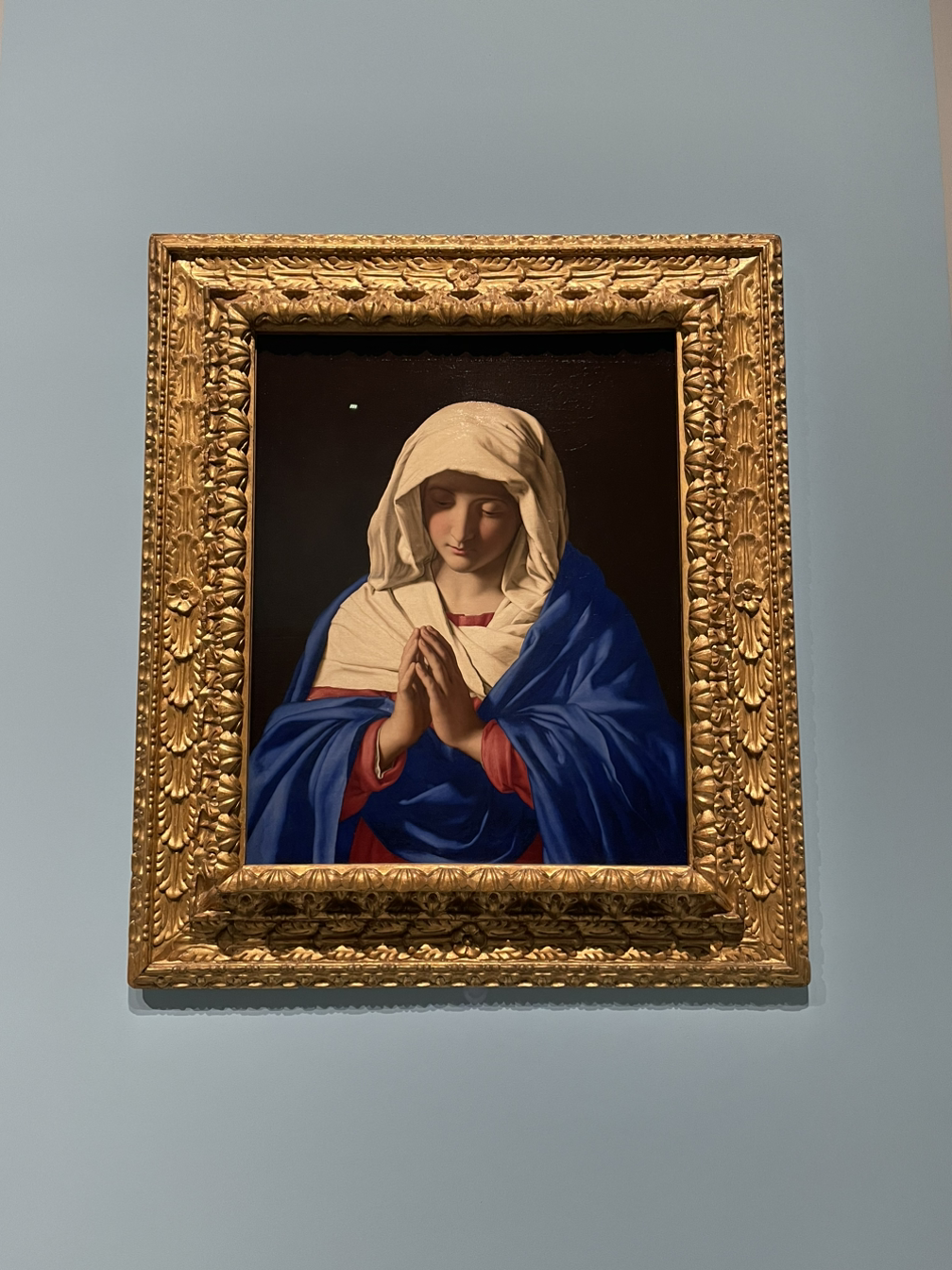 베네딕토 수도회를 위해 라파엘로의 작품들을 복제해온 신심 깊은 사소페라토가 가톨릭 종교개혁 운동의 요구에 부응해 그린 그림인데, 실로 경건해지는 성모님의 모습이다.