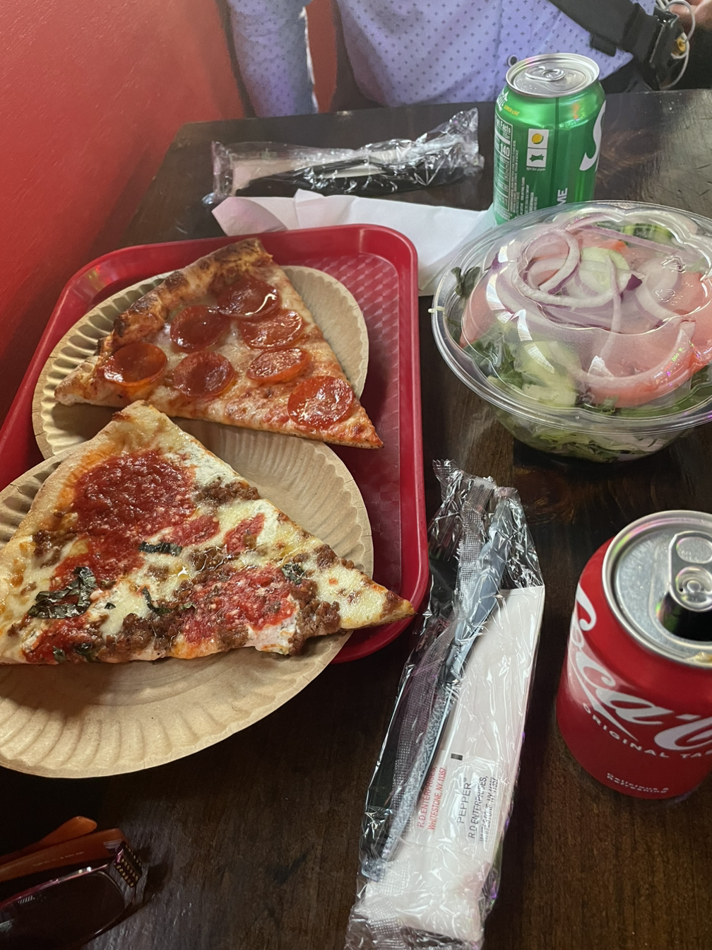 가려던 식당이 문을 닫아 할 수 없이 되돌아와 기자단이 몰려 있는 그 공원 옆 피자 가게에서 늦은 점심을 먹기로 했다. 도로변까지 나온 식당 자리에 앉아 혹시 트럼프 머리라도 볼 수 있을까 싶었던 거다.