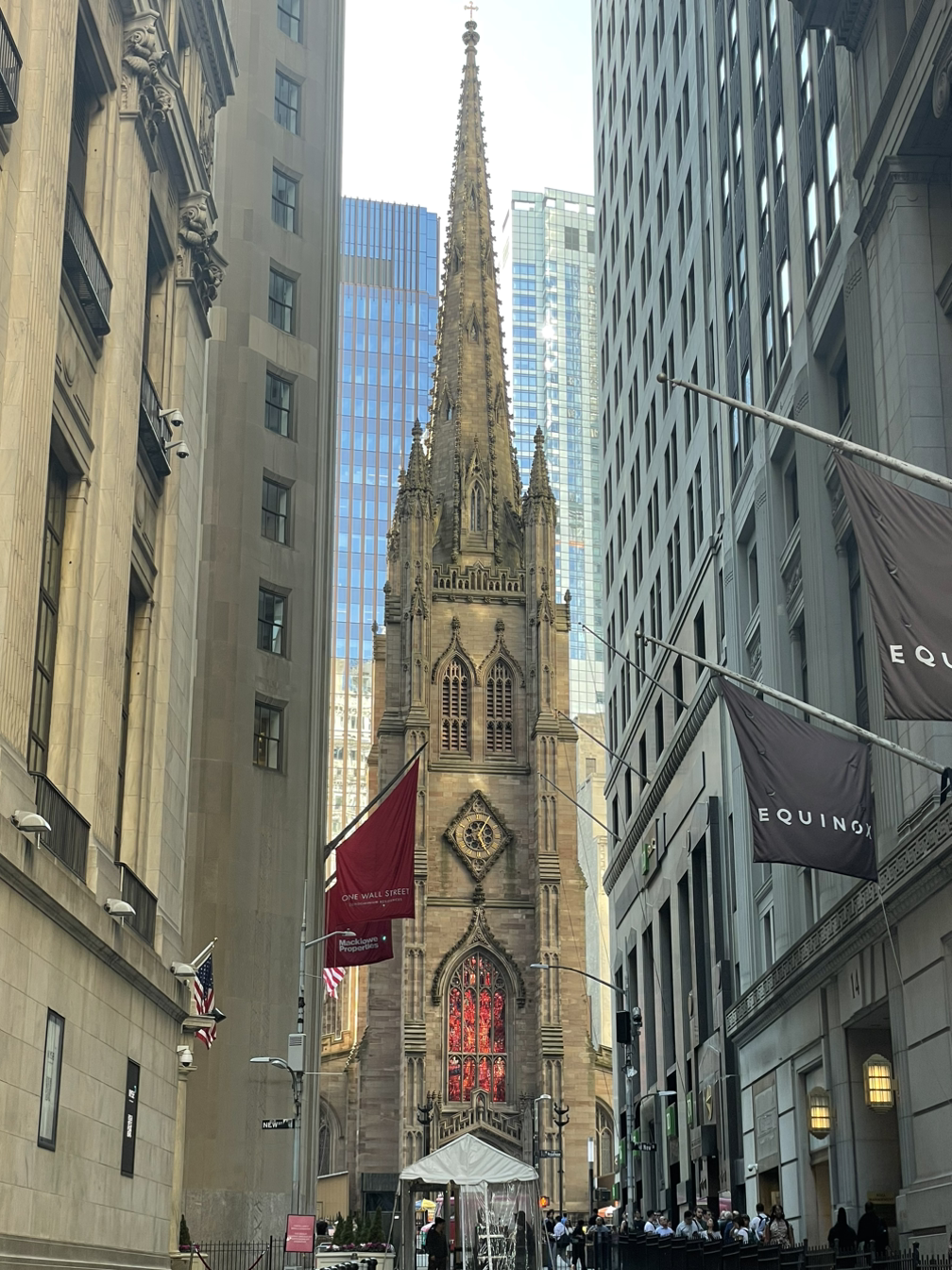 뉴욕의 역사적인 명소가 한데 모여있는 월 스트리트에 드디어 입성했다!! 유서 깊은 성공회 교회이자 묘지인 '트리니티 교회'가 보였는데 여기에 뮤지컬로 더욱 유명해진 '알렉산더 해밀턴'을 비롯한 초기 미국인들이 묻혀있다.