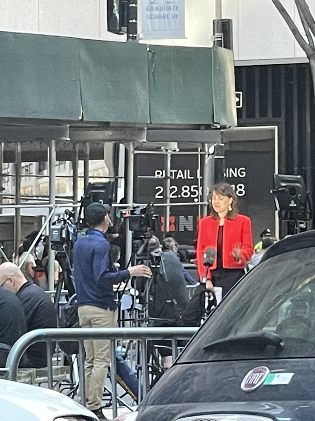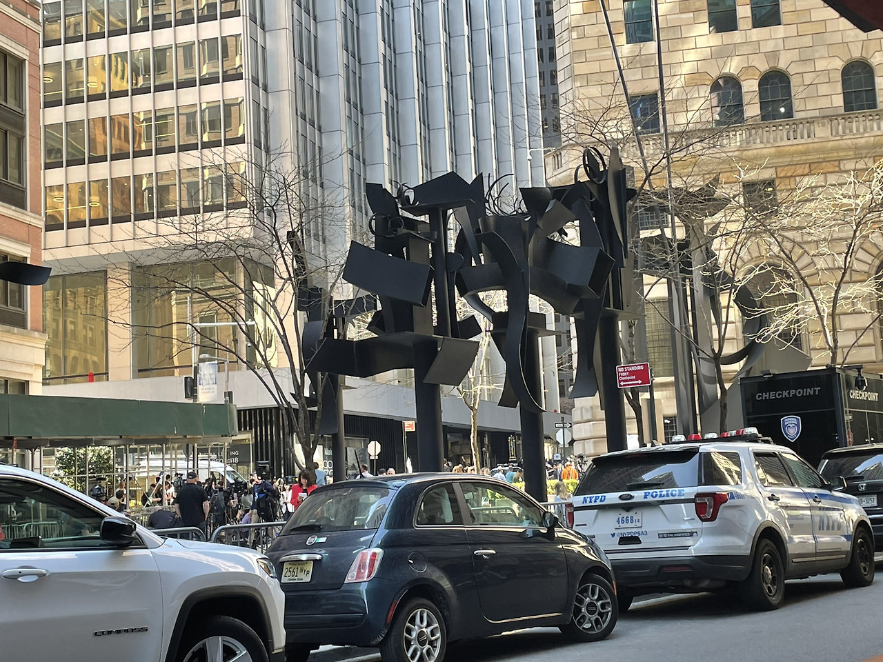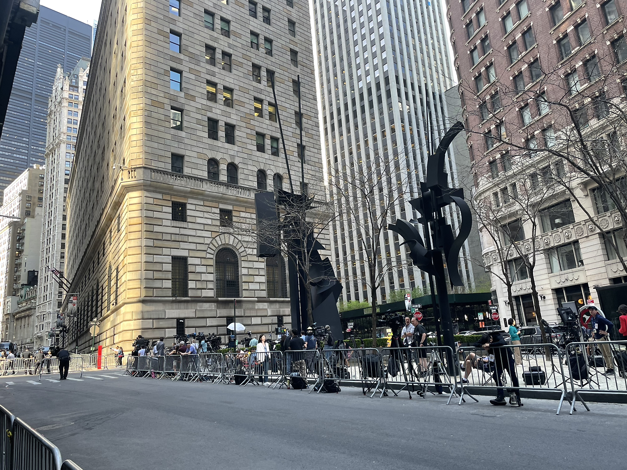 작고 긴 삼각형 모양의 공원인 '루이스 네벌슨 플라자'라는 곳을 지나는데 한 무리의 기자단들이 모여 있었다. 혹시 트럼프? 하고 있는데 남편이 이미 포진해 있는 뉴욕 경찰관(NYPD!!)에게 물어보니 트럼프 때문이라고 친절히 답해줬다. 성추문으로 기소된 트럼프가 형사법원에 마지막으로 출두한 날이었던 거다.