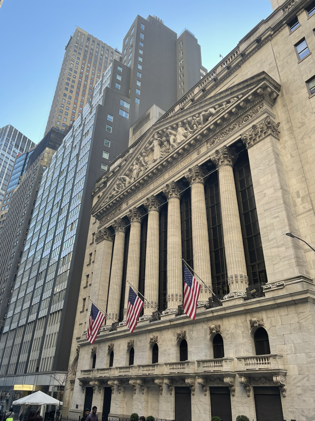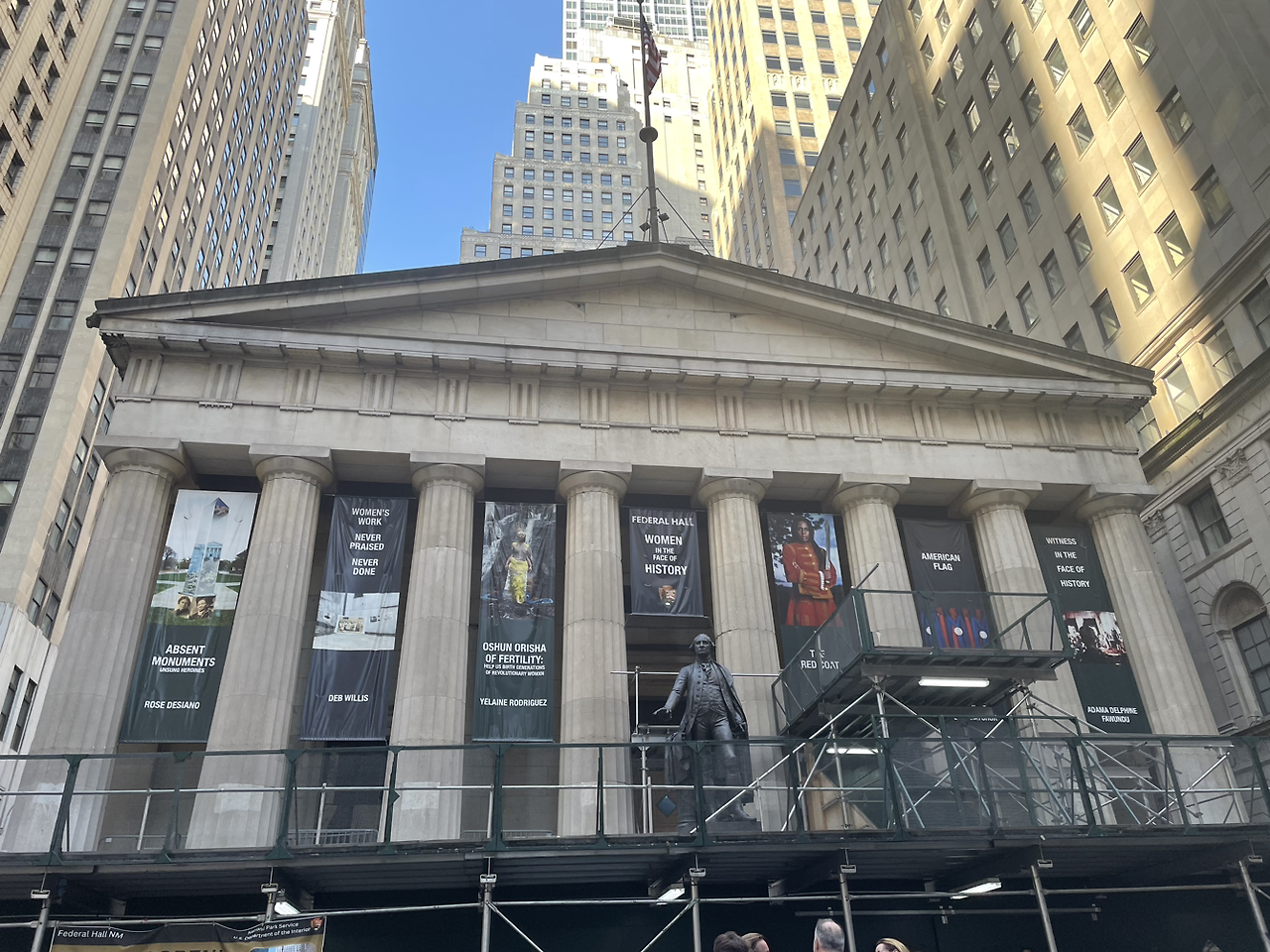 미국 경제의 상징인 '뉴욕 증권거래소'와 조지 워싱턴이 지키고 서있는 미국 의회 구 의사당인 '페더럴 홀'이 서로 마주 보며 서있다.