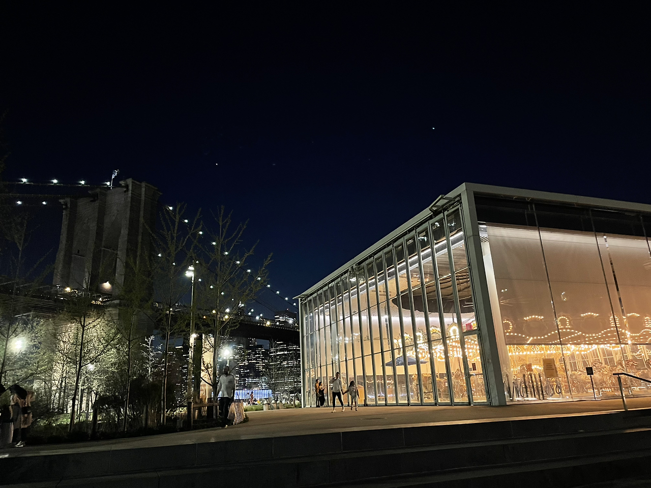 밖으로 나가니 어둑해졌으나 뉴욕은 한층 더 빛나고 있었다. 'Jane's Carousel'라는 회전목마가 있는데, 1922년에 만들어져 원래 오하이오의 이도라 파크(Idora Park)에 있었으나 공원이 폐업하자 데이비드 월렌타스라는 억만장자 부동산 개발업자가 경매로 사들여 이곳으로 가져와 아내의 이름을 붙인 거다. 낭만 이면엔 언제나 상상할 수 없는 돈이 있는 것 같다. 그래서 뉴욕인 걸까...