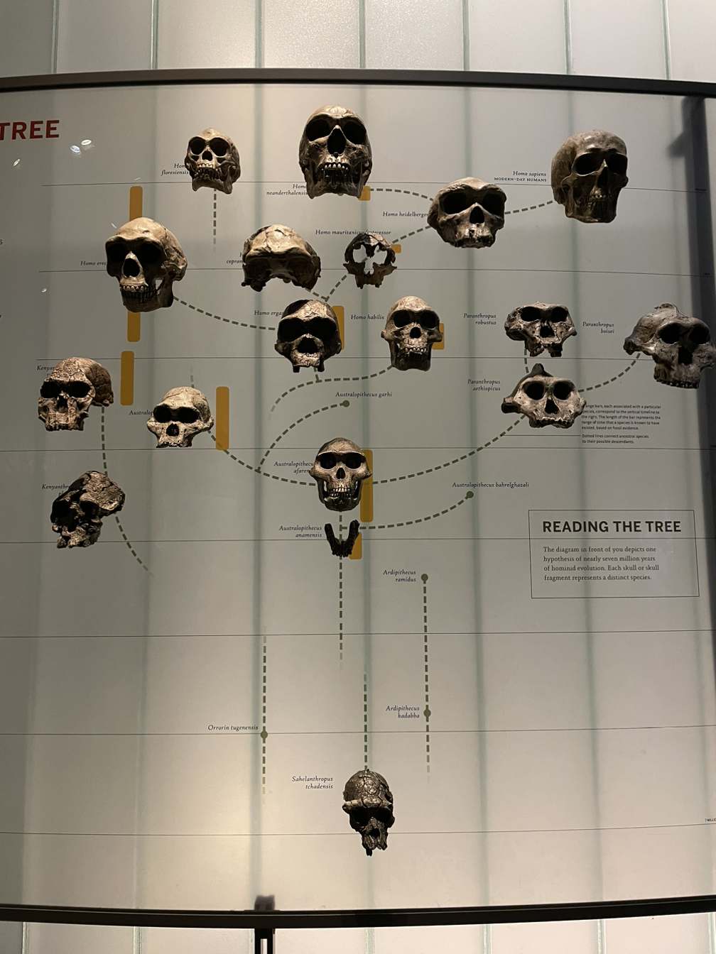 맨 위 오른쪽이 현생 인류인 '사피엔스인'인데, '네안데르탈인'과 함께 '하이델베르크인'에서 진화됐음을 나타내고 있다. 유발 하라리는 네안데르탈인이 사피엔스인들에게 학살당해 일순간에 사라졌다고 추측했으나 두 인류가 수천 년 동안 공존했다가 결국 사피엔스들의 네트워킹과 두뇌의 우수함으로 살아남았다는 증거들이 나오고 있다고 한다.