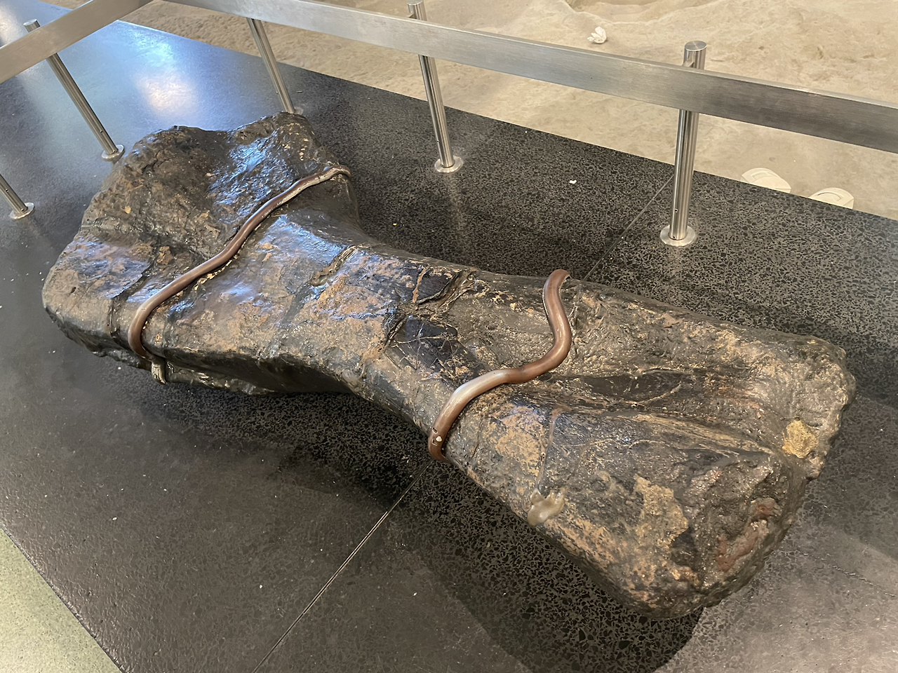 사람의 어깨와 팔꿈치 사이에 있는 팔 뼈에 해당되는 아파토사우루스의 뼈인데 만져만 봐도 기분이 묘했다.