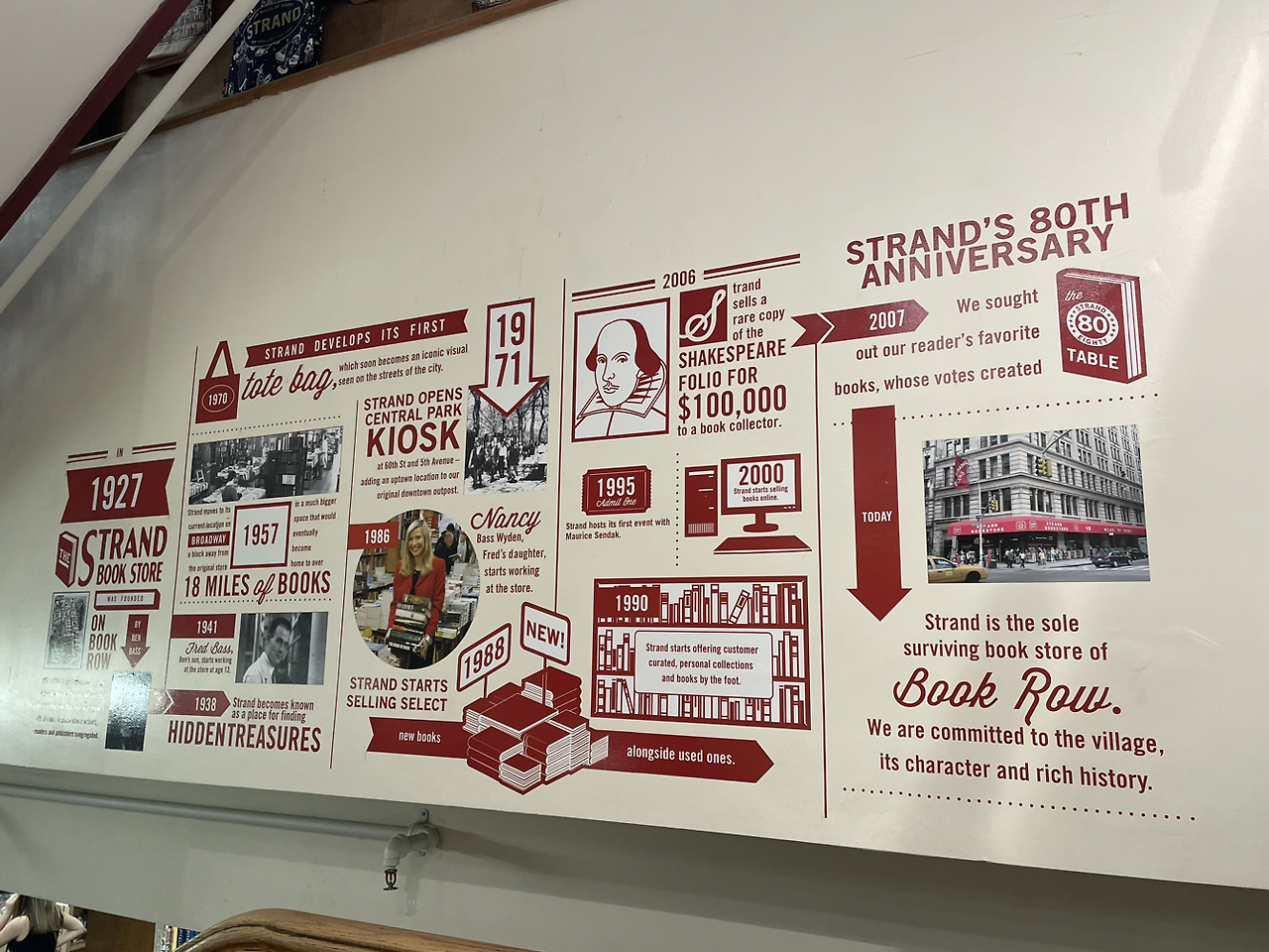 올해로 96년째 운영 중인 스트랜드 서점의 역사를 한눈에 알 수 있게 일러스트로 꾸며놓았다. 리투아니아 출신의 이민자 가정에서 태어난 '벤저민 배스'는 26세가 되던 해인 1927년에 소장한 책들을 모아 작은 서점을 열었다. 런던의 유명 출판 거리인 '스트랜드'를 따와 서점 이름을 짓고 아들 프레드에 이어 지금은 손녀인 낸시 배스가 3대째 이어온 거다. 이 서점은 '18 miles of books'로 유명한데, 스트랜드가 보유한 250만 여권의 책들을 늘어놓으면 '18마일(약 29km)'이 된다는 거다. 그러나 코로나19 여파로 폐업 위기에 처하자 낸시의 절박한 SNS 호소로 독자들이 뜨거운 성원을 보내 기사회생했다고 한다. 100주년이 될 2027년엔 어떤 행사가 있을지 벌써부터 기대가 된다.