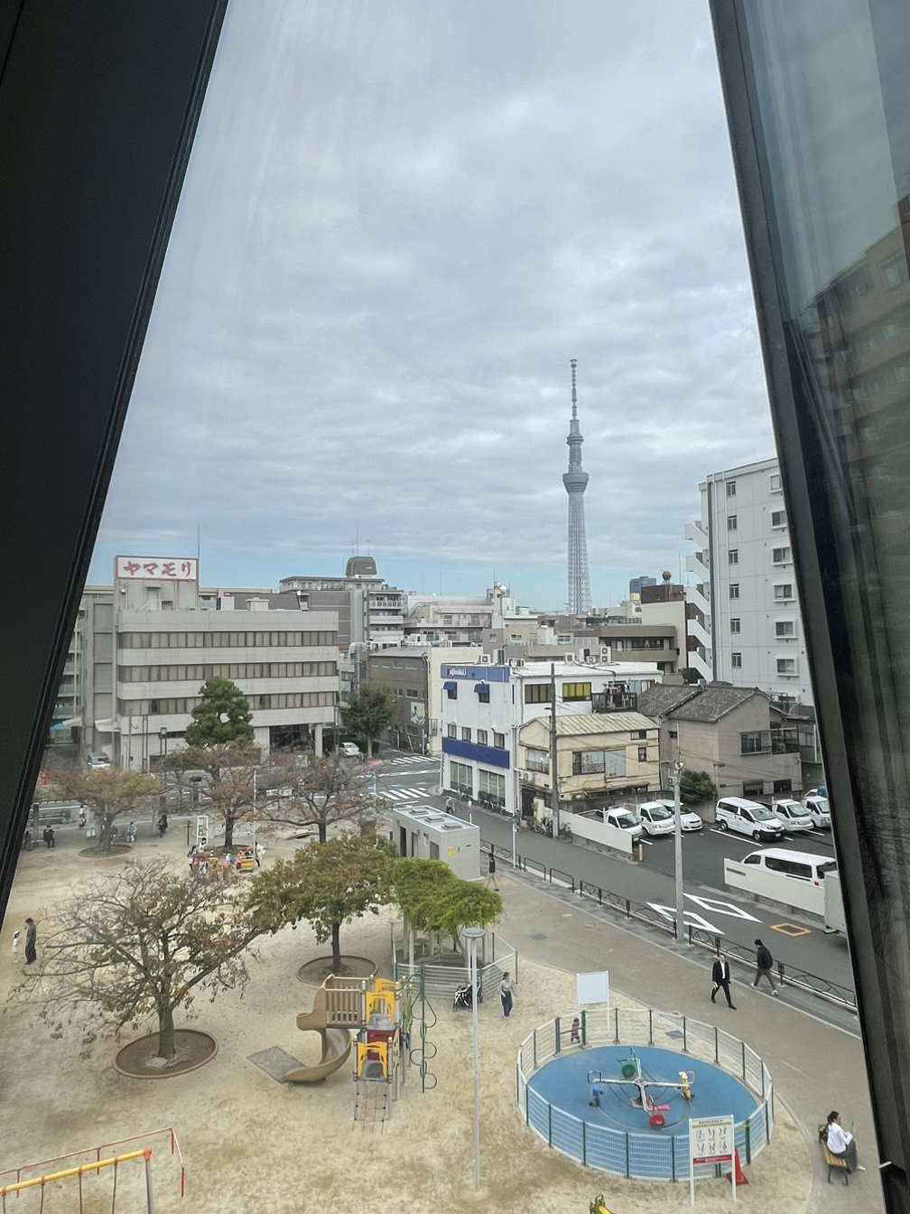 계단 중간의 창 틈으로 도쿄 스카이트리가 아주 가까이 보였다.