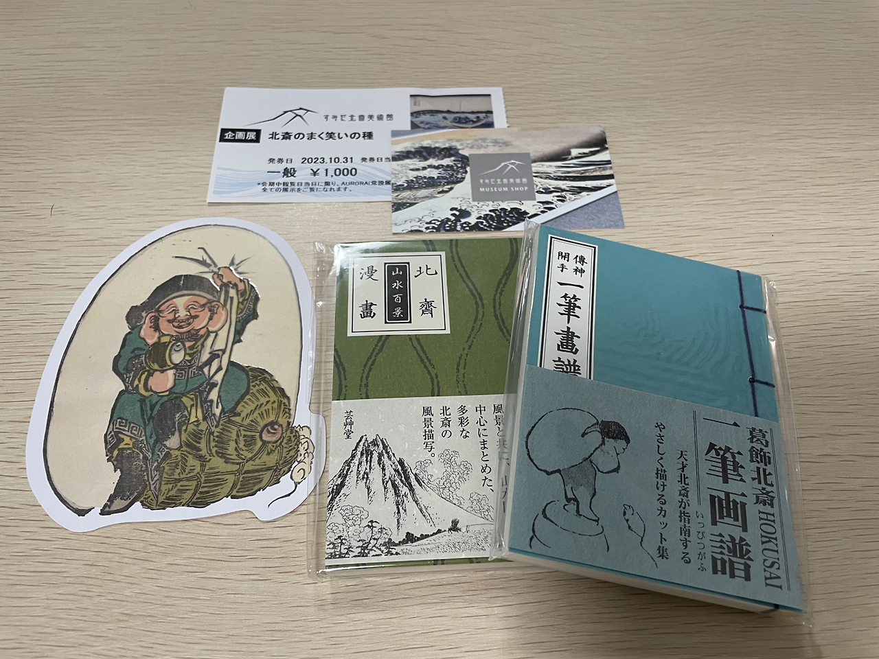 7복신 중 어업의 신인 ‘에비스 신’을 그린 호쿠사이의 그림을 기념 선물로 받았다. 특별전에서 들춰본 스케치 노트를 미니 사이즈로 만들어 팔고 있어 고르느라 고심했다.