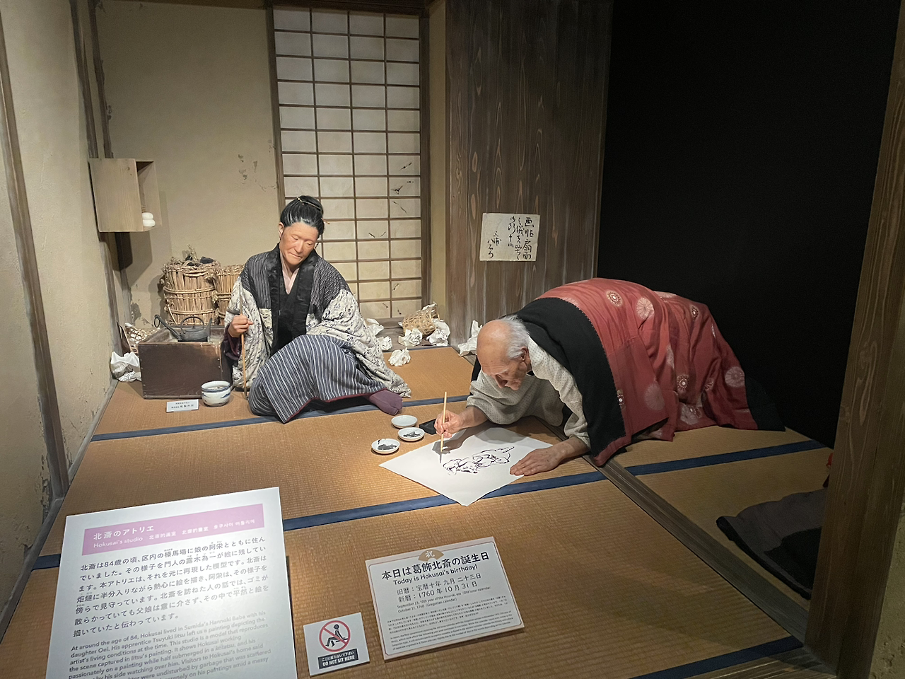 84세의 호쿠사이가 스미다에서 딸 ‘오에이’랑 살며 그림을 그리고 있는 모습을 밀랍 인형으로 만들어 전시해 놨는데 진짜 같아 깜짝 놀랬다.