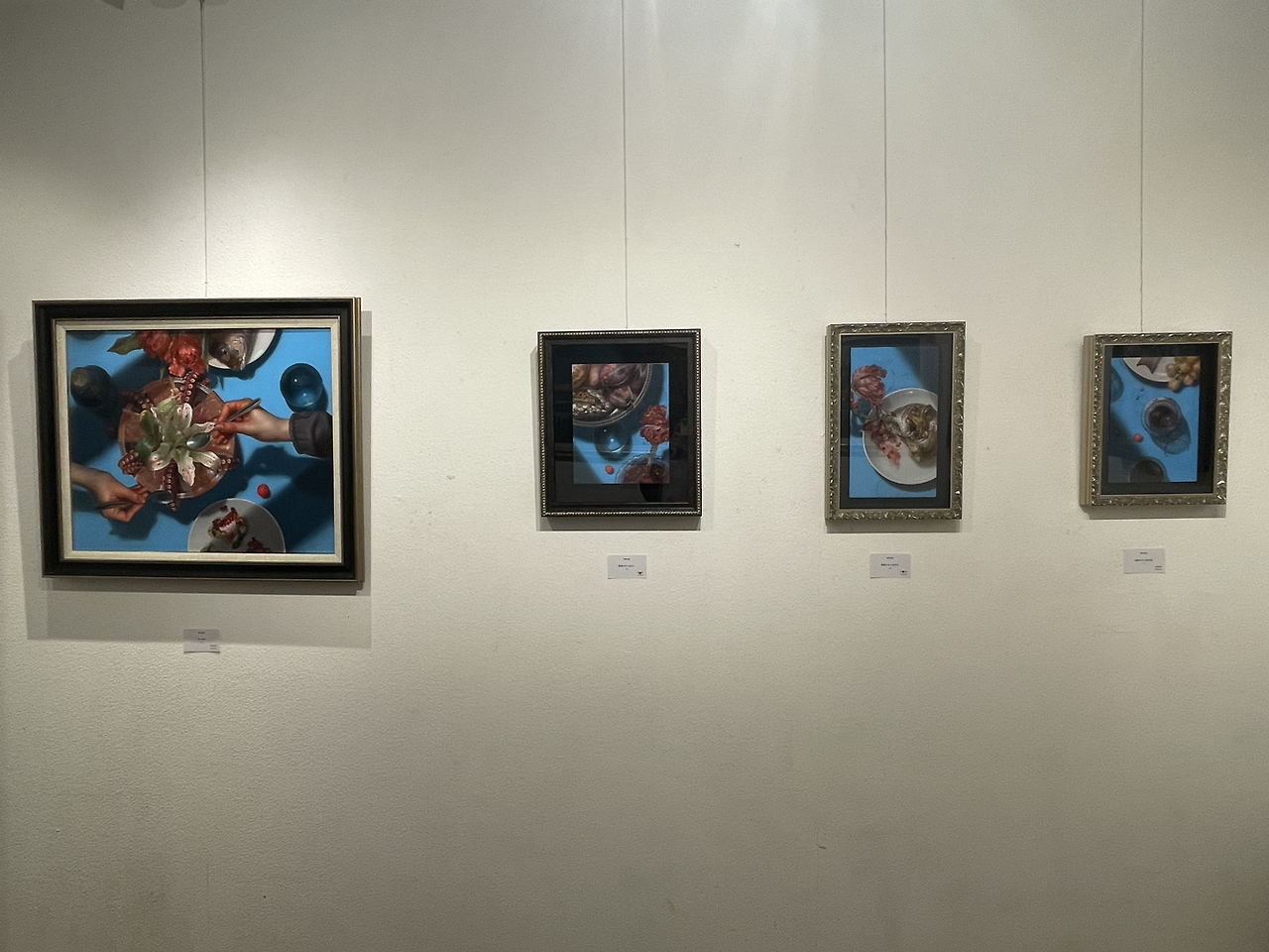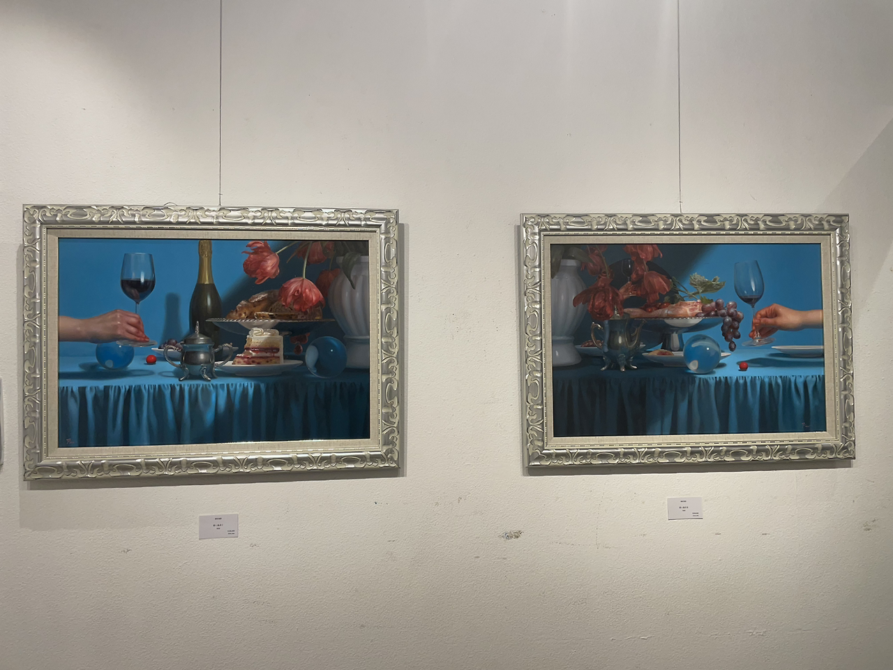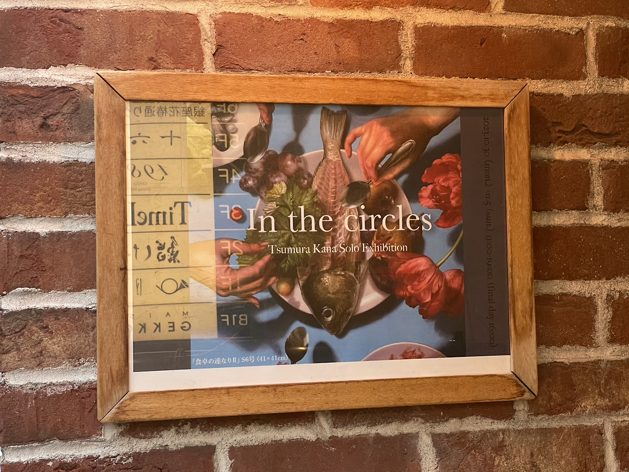 바도 함께 운영 중인 아주 좁은 곳에 두 여성이 마주 앉아 있었는데, 당황하는 나와 눈을 마주친 여성이 상냥하게 어서 오라 맞아주어 할 수없이 머뭇거리며 안으로 들어갔다. 식탁 위의 음식들을 사실처럼 그린 유화가 전시되어 있었고, 츠무라 카나(津村 果奈)라는 화가가 함께 자리를 지키고 있었던 거다. 미술대학을 졸업하고선 여러 번의 그룹전에 참가한 후 처음으로 개인전을 연다고 했다. 素晴らしいですね!! おめでとうございます~ (굉장하네요!! 축하드립니다~) 하며 인사를 건넸다.