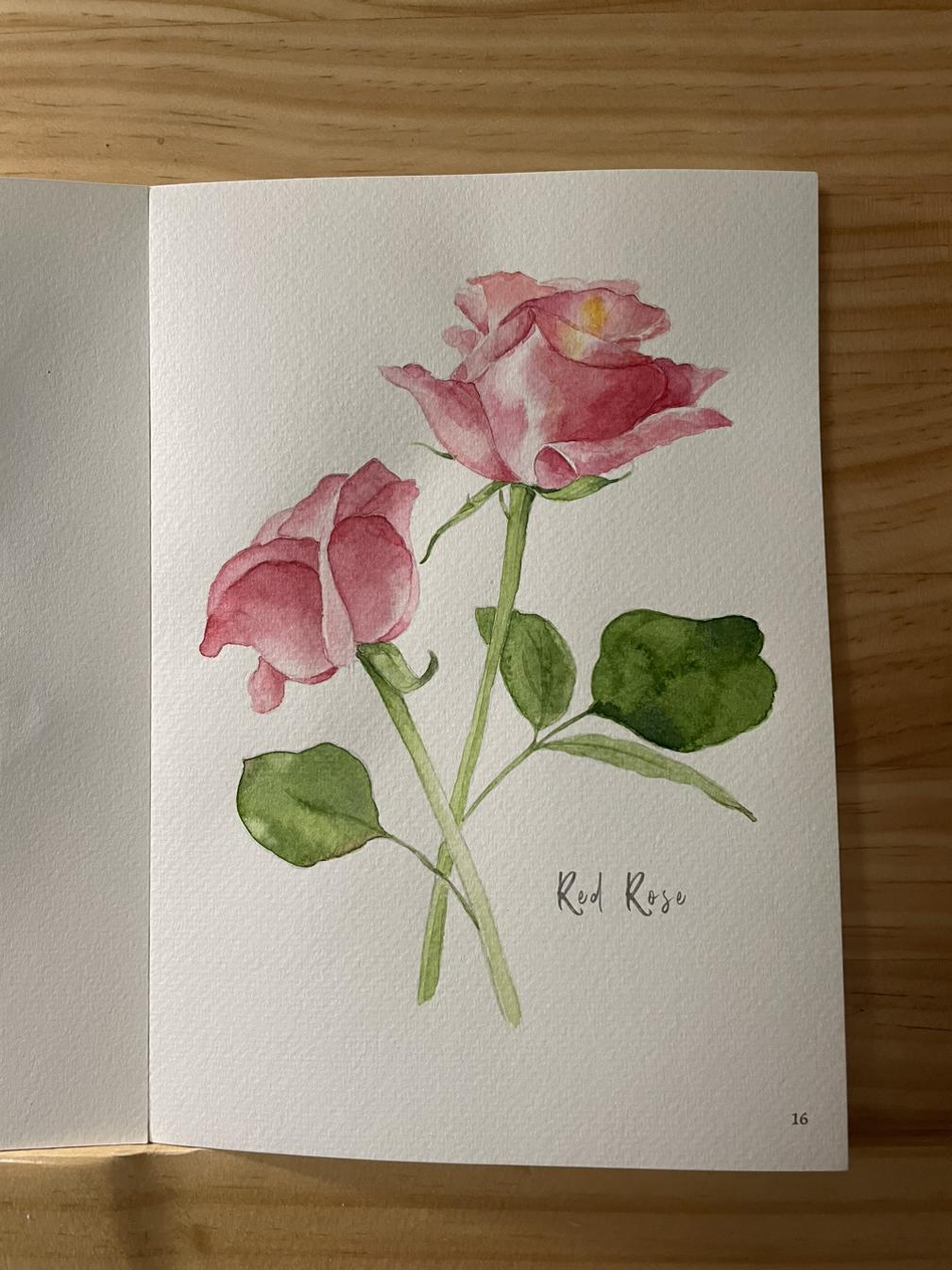 오늘의 컬러링 연습은 색상만 참고하고 내 나름대로 칠해보기로 했다. 오른쪽 나뭇잎은 크게 물얼룩이 저버렸지만, 왼쪽 나뭇잎은 색감이 비교적 잘 나왔다. 꽃은 서너 번 색을 올려가며 깊이감을 표현해야겠다. 붓을 좋은 걸로 바꿨더니 느낌이 한결 부드러워졌다.