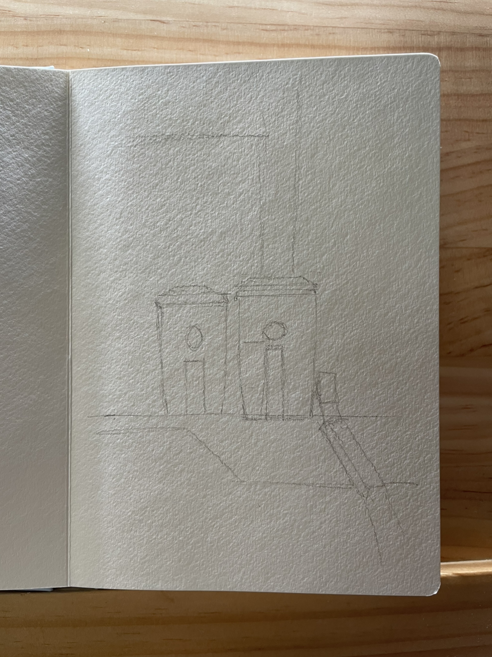 샤리 강좌 자료 사진인 두 개의 쓰레기통을 러프하게 연필로 스케치를 했다.