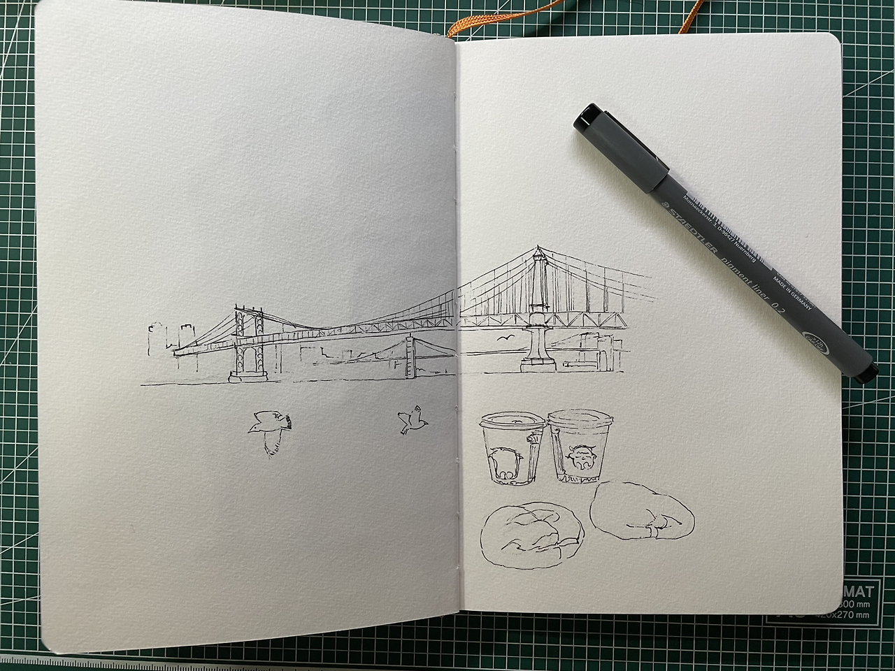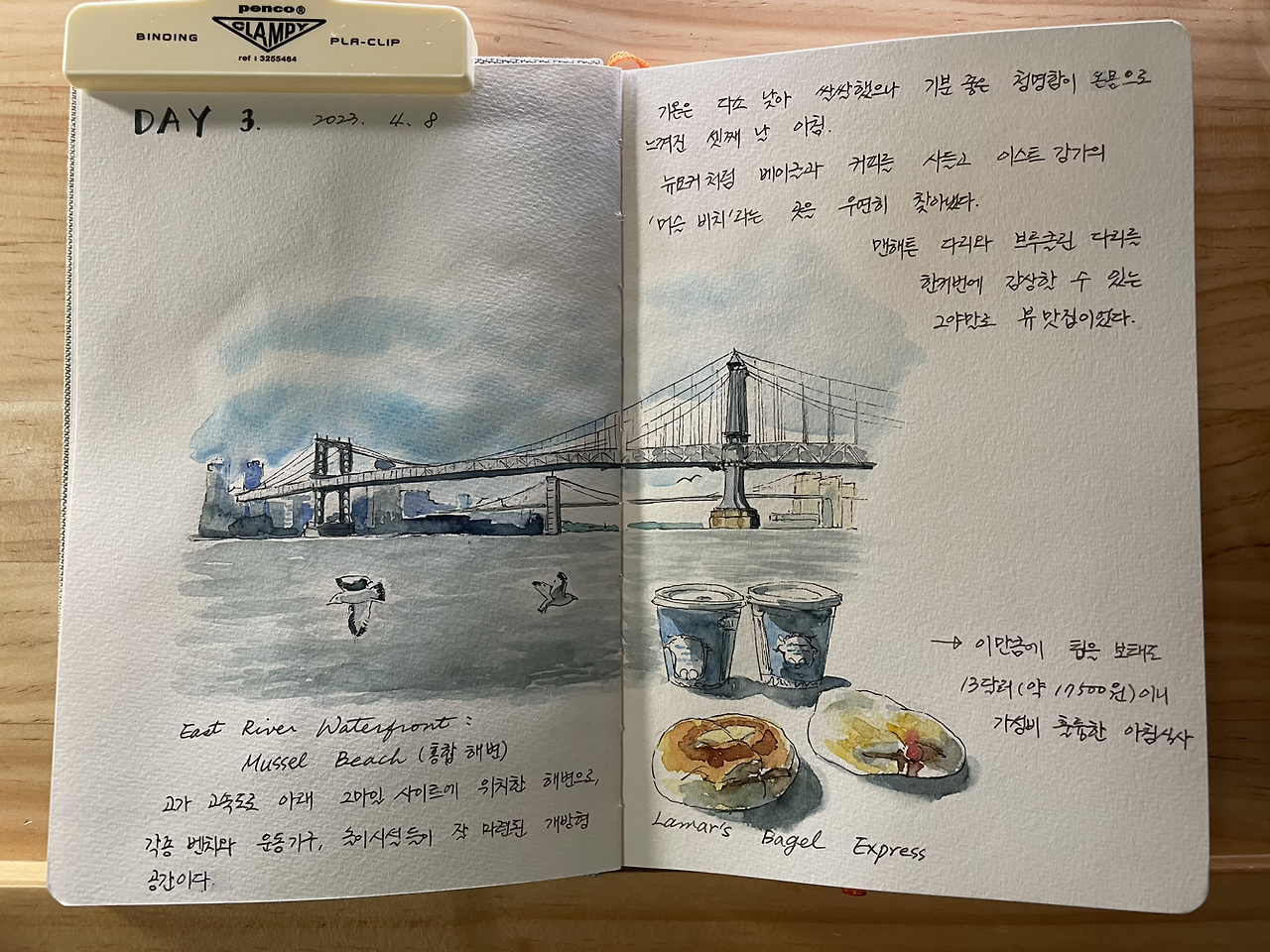 이스트 강 위에 놓여있는 맨해튼 다리와 브루클린 다리를 그리고 커피와 베이글을 크게 그려 넣었다. 강 위를 날아다니는 갈매기들도 그리고…