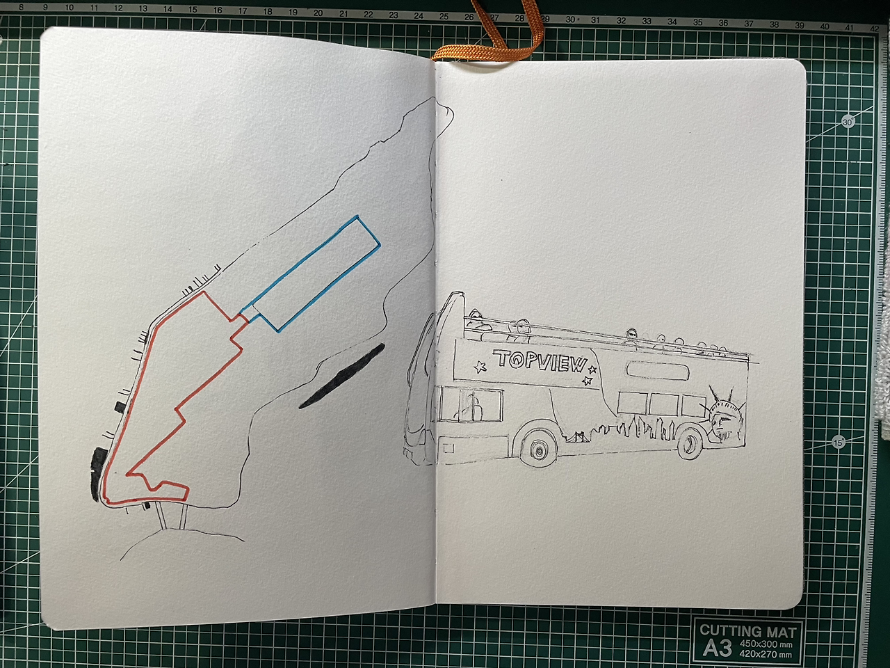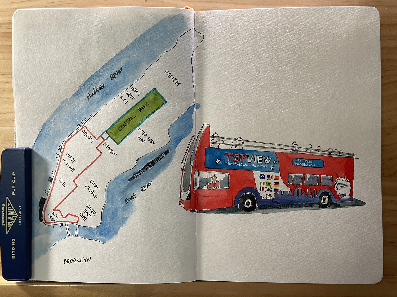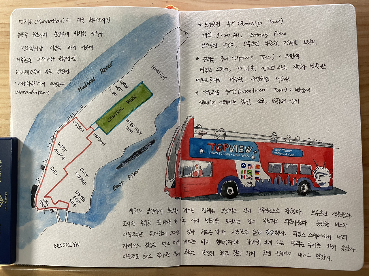 탑뷰 버스를 타고 돌아본 걸 표현하기 위해 맨해튼 지도를 그린 후, 투어 코스도 그려 넣었다.