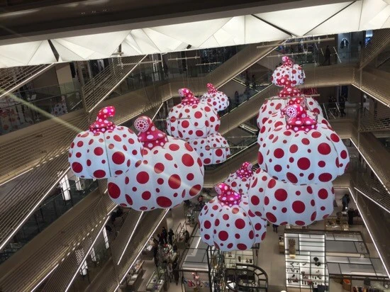 쓰타야 긴자점이 있는 ‘긴자 식스’란 쇼핑몰로 들어가니 천장에 아주 낯익은 작품들이 매달려 있었다! 바로 호박을 너무나 사랑하는 예술가 ‘쿠사마 야요이(草間彌生)’의 빨간 점박이 호박들이었다.