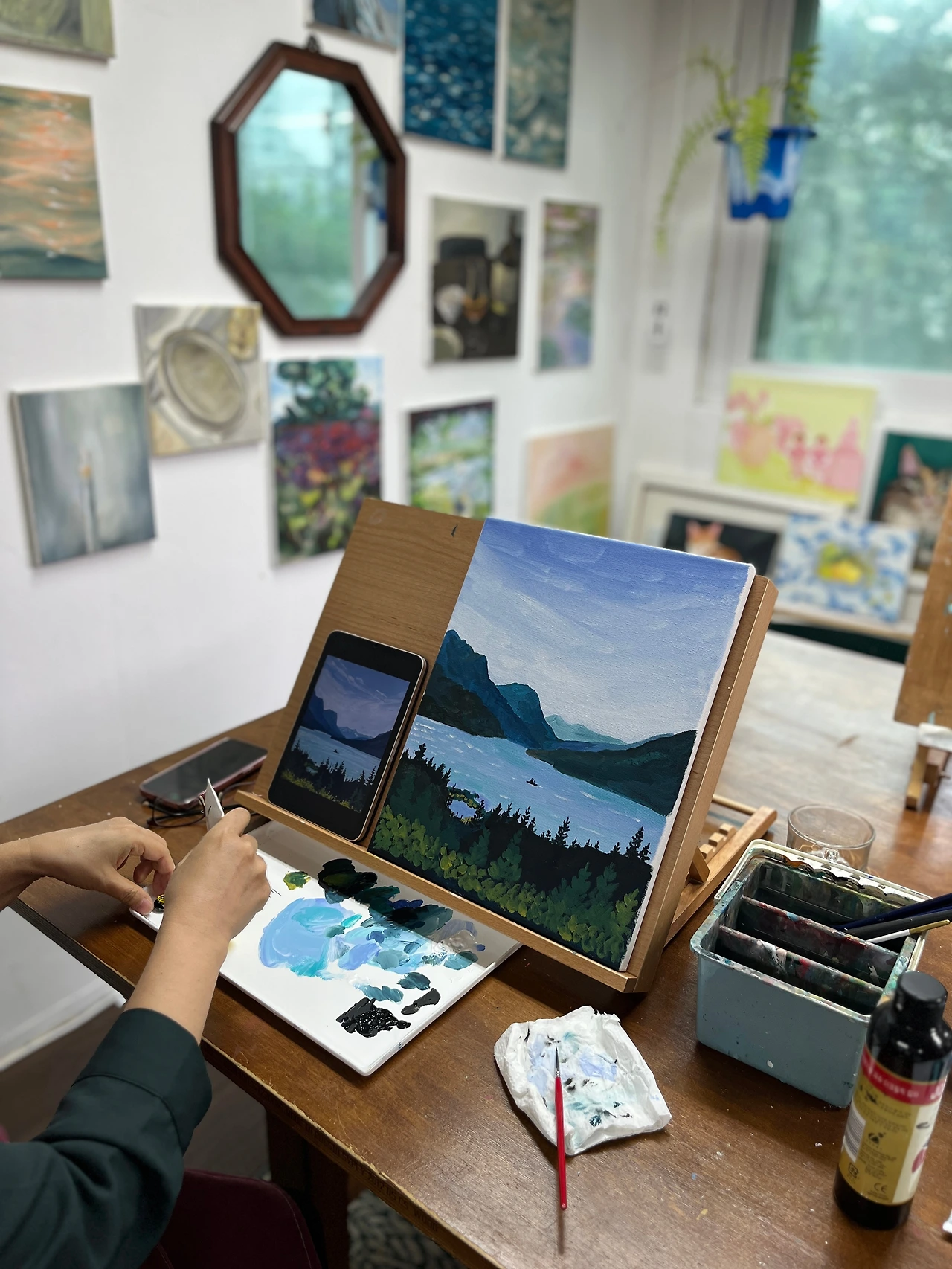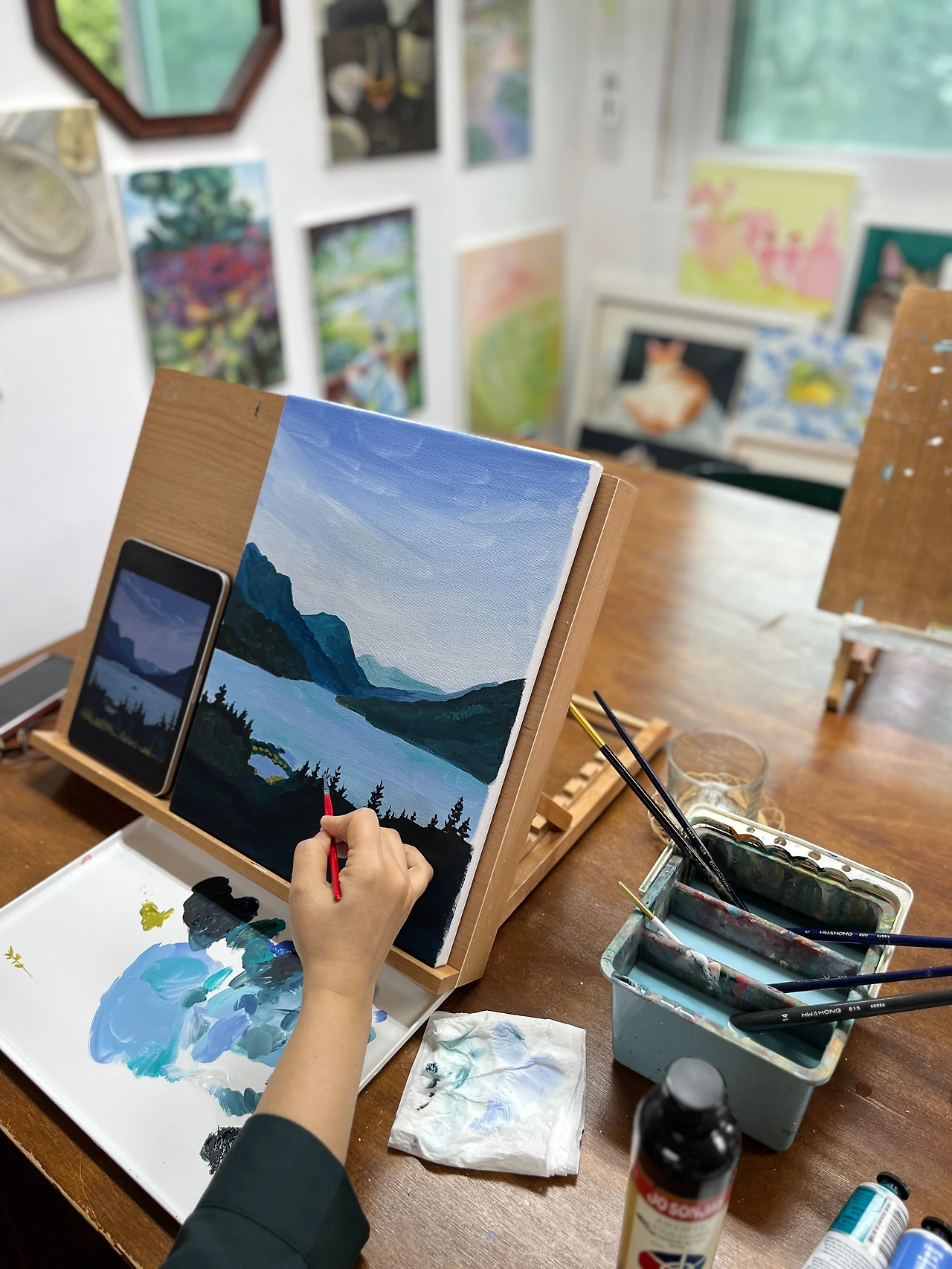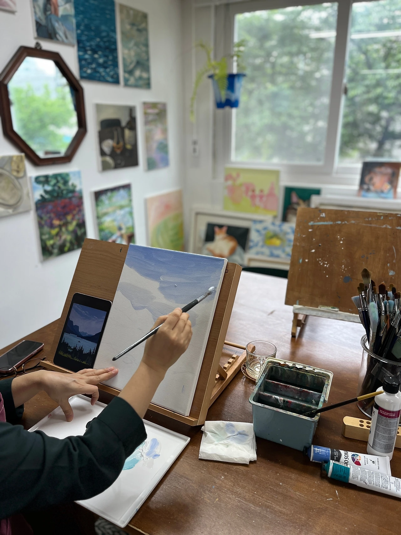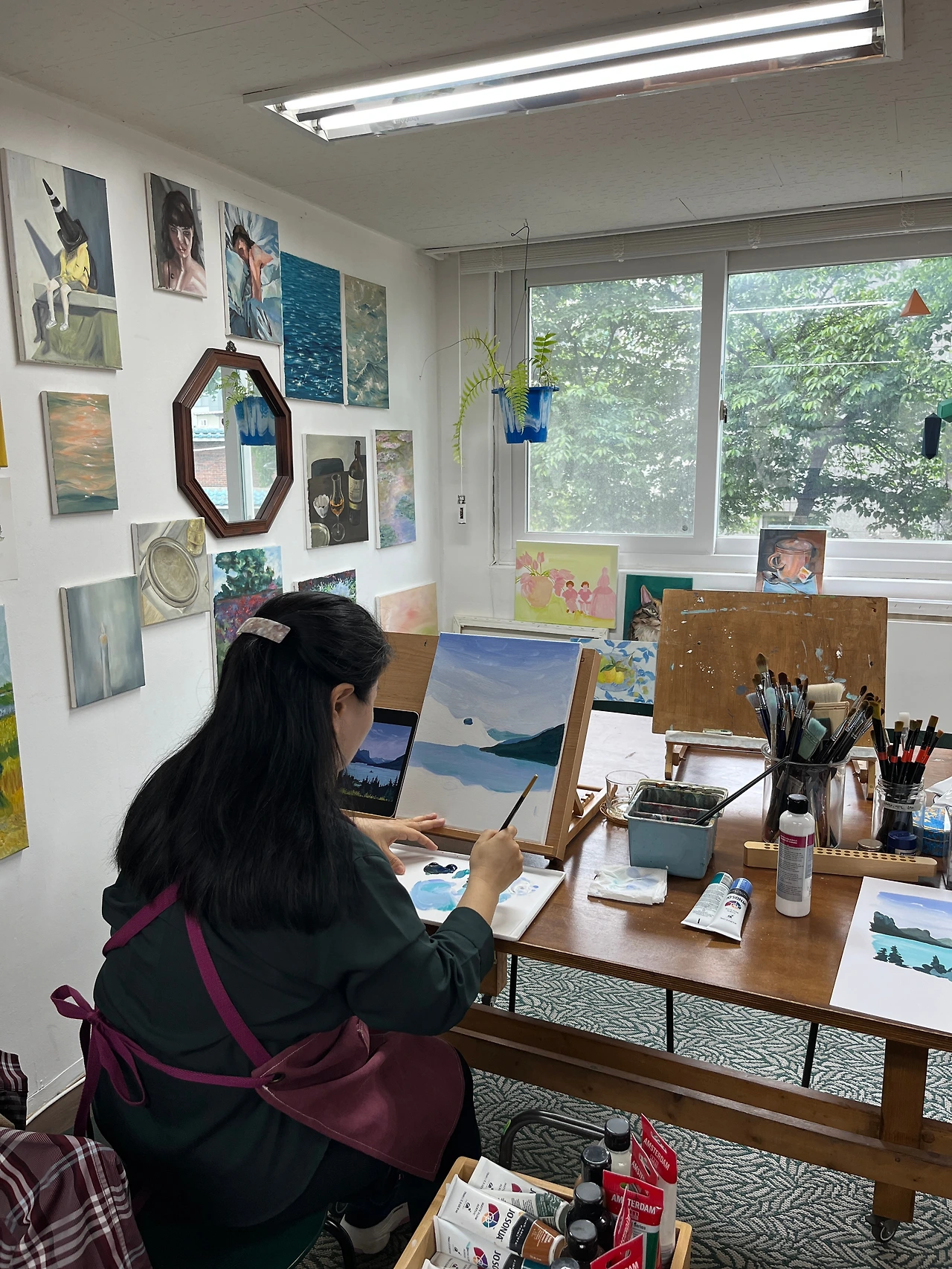 집에서 앞치마를 가져갔다. 비가 와서 화실이 더 운치 있었는데 쌤이 사진을 찍고 있는 줄도 모를 정도로 그림에 빠져 있었다.