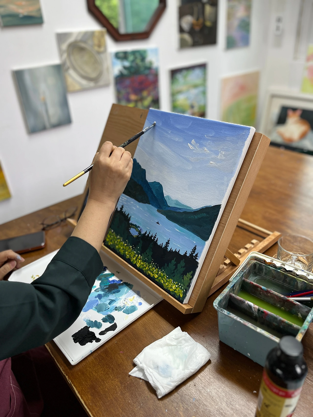 나무들 사이로 보이는 작은 물웅덩이의 표현이 많이 아쉬웠는데 쌤이 과감한 터치로 덧 그려줘 아하! 하며 또 배웠다. 물감을 아낌없이 써야 그림이 잘 그려진다는 의미를 알게 된 수업이었다. 주어진 그림이나 사진은 참고일 뿐이니 상상력을 좀 더 넓혔으면 좋겠다.