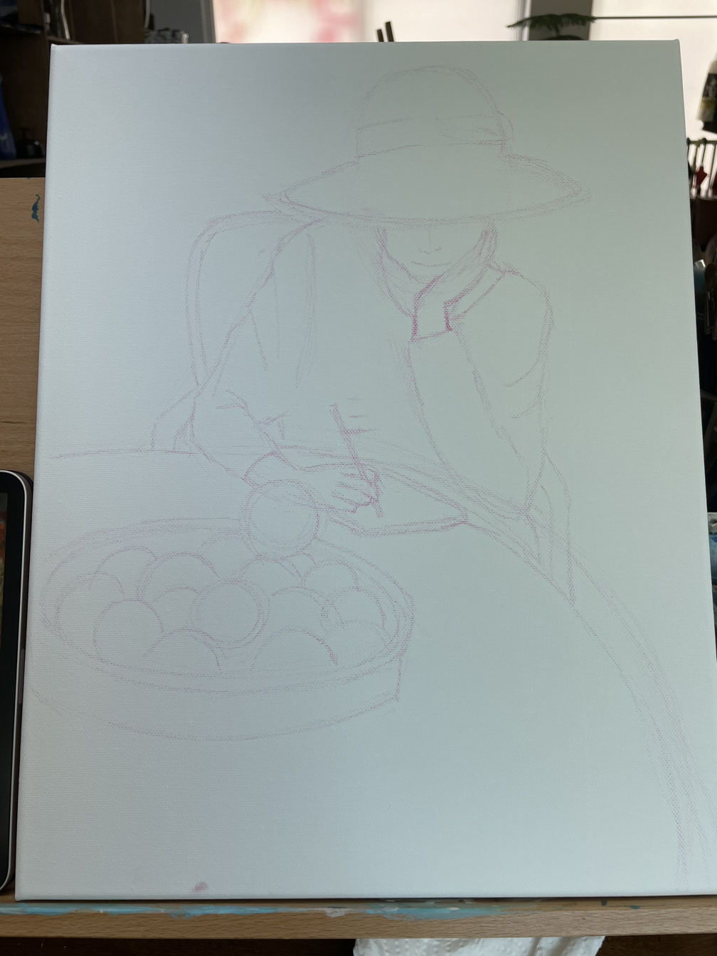 분홍 색연필로 캔버스에 중심을 잡은 후 슥슥 스케치를 했다.