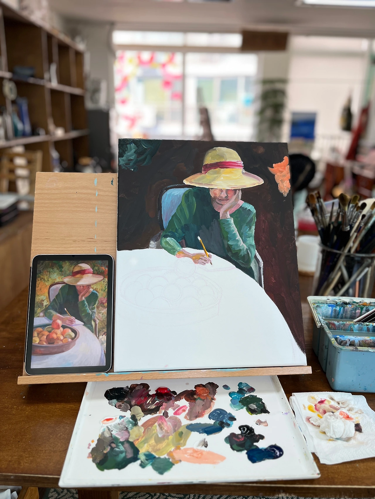 모작하고 싶은 그림을 핀터레스트에서 찾아보는 게 숙제였다. 한참을 서치한 끝에 가져간 그림은 오후의 밝은 햇살 아래 무언가를 쓰고 있는 여자의 모습이었는데 색감이 우선 마음에 들었다.