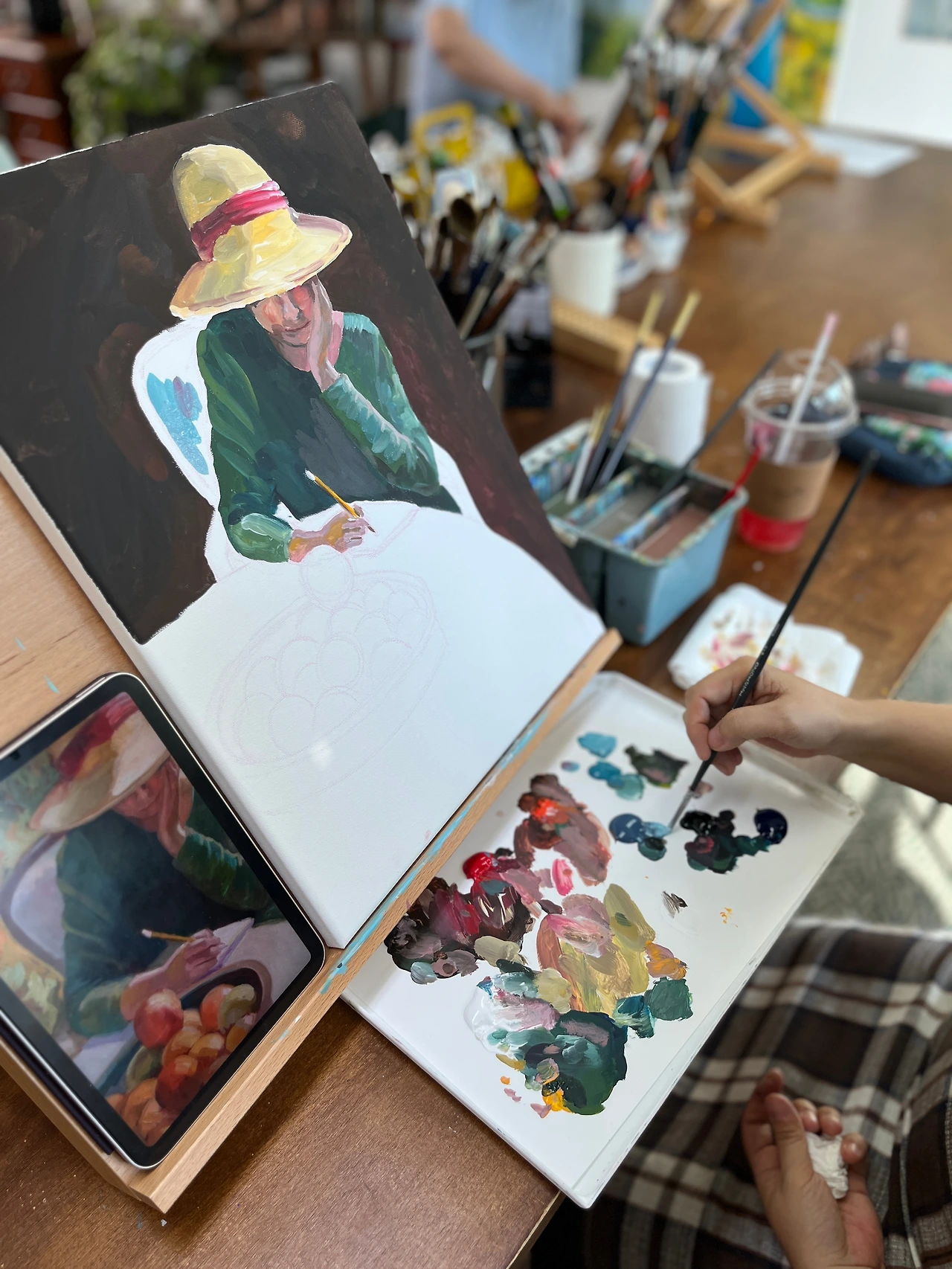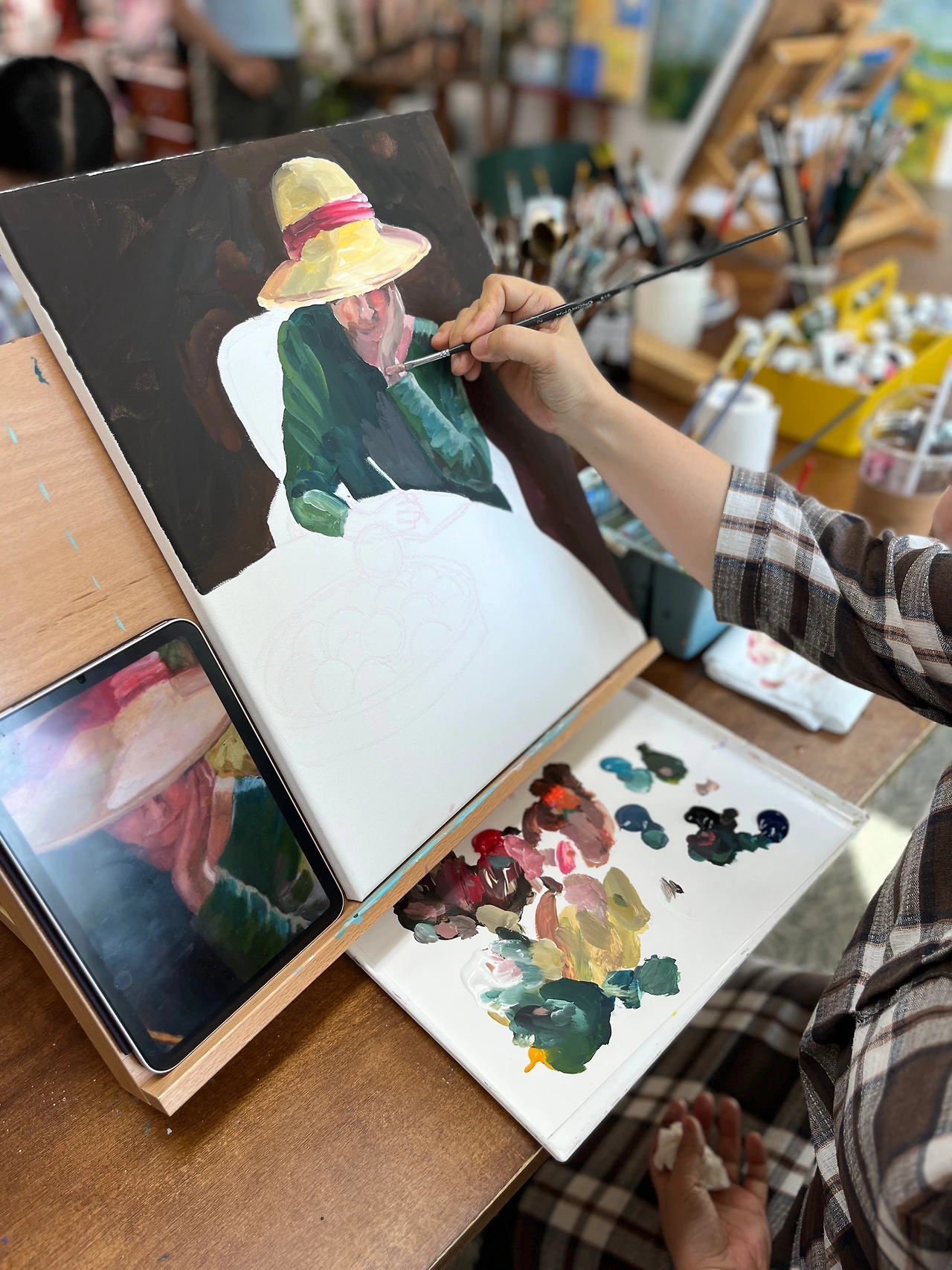 물감은 어떤 색을 짤지 붓은 어떤 크기를 고를지, 처음엔 무척 당황했었으나 아주 조금 익숙해졌다. 바탕을 칠한 후 모자 부분은 쌤이 시연해 줬는데, 어둠과 밝음을 구역별로 나눠 칠해야 한다는 게 큰 배움이었다.
