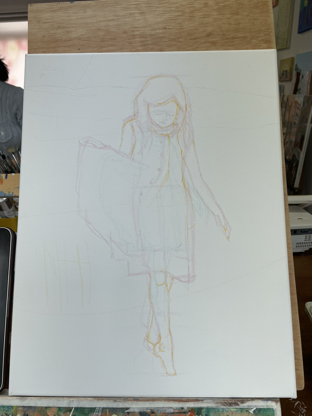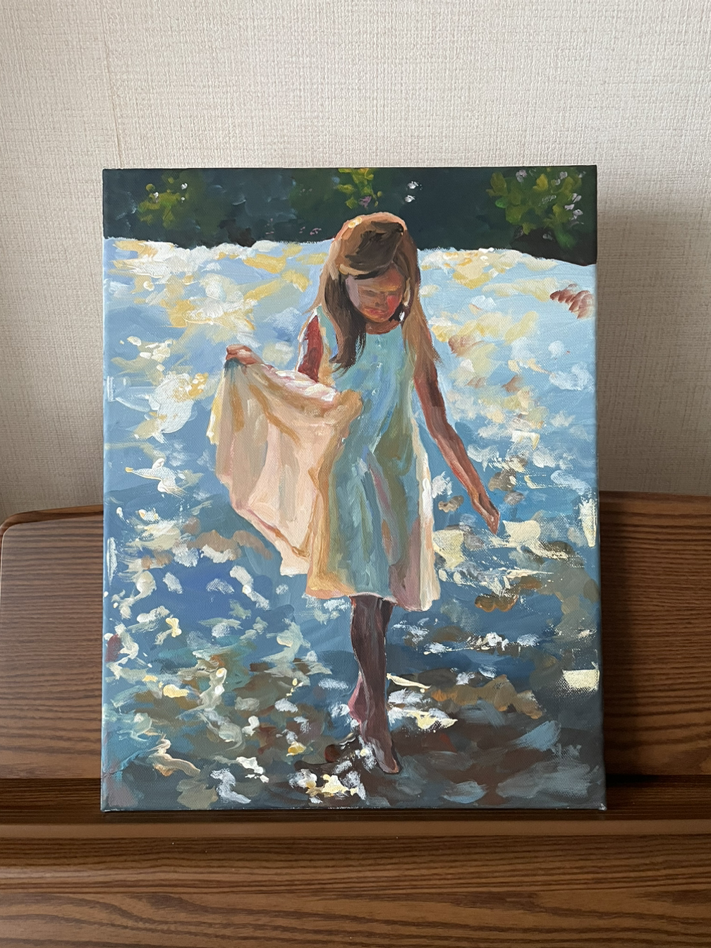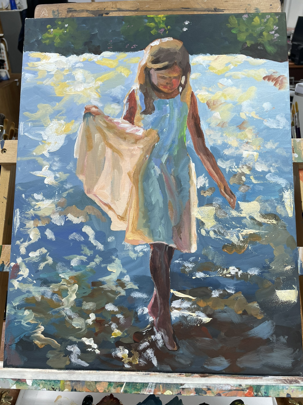 뒷배경과 햇빛에 비쳐 반짝이는 강물 위 윤슬과 치마까지 쌤의 도움을 받아 가며 겨우 완성했다. 구불구불 붓질이 이게 맞나 싶었는데 멀찍이서 바라보니 눈부신 햇살 표현이 나와 신기했다.