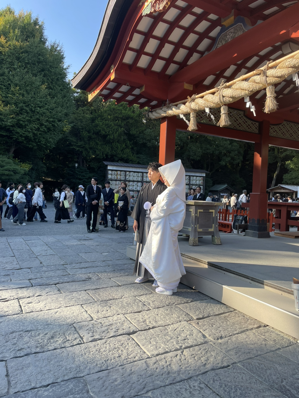 그런데 ‘하배전(下拝殿)’이라 불리는 춤추는 무대(舞殿)에서 결혼식이 거행되고 있어 다른 관광객들과 진귀한 구경을 했다. 남편과 왔던 때는 아이들의 성장 축하날인 ‘시치고산(七五三)‘ 때여서 예쁜 기모노를 입은 아이들을 봤었는데 이번엔 전통 혼례식을 직관한 거다.