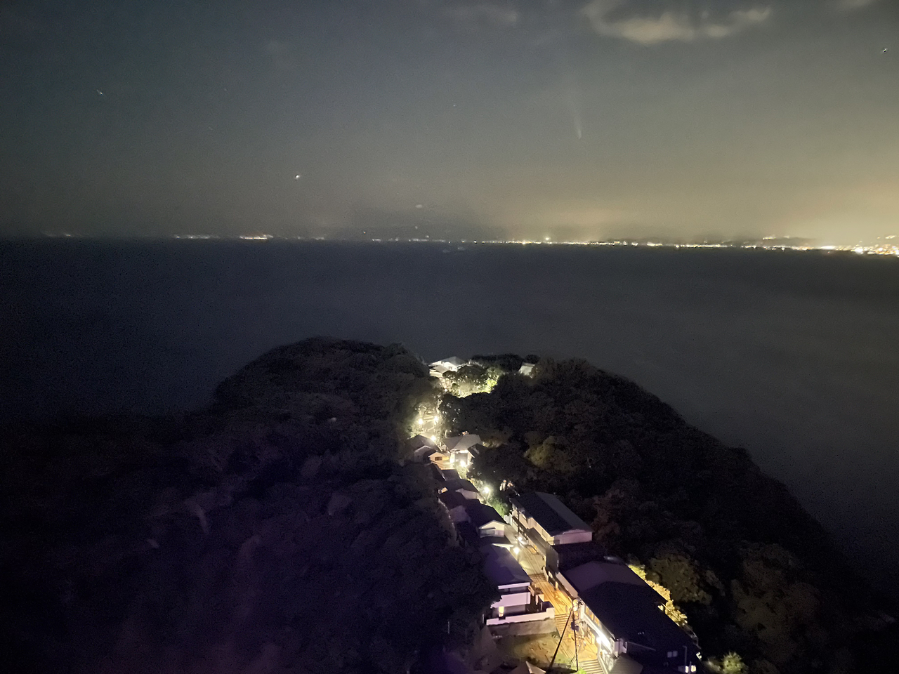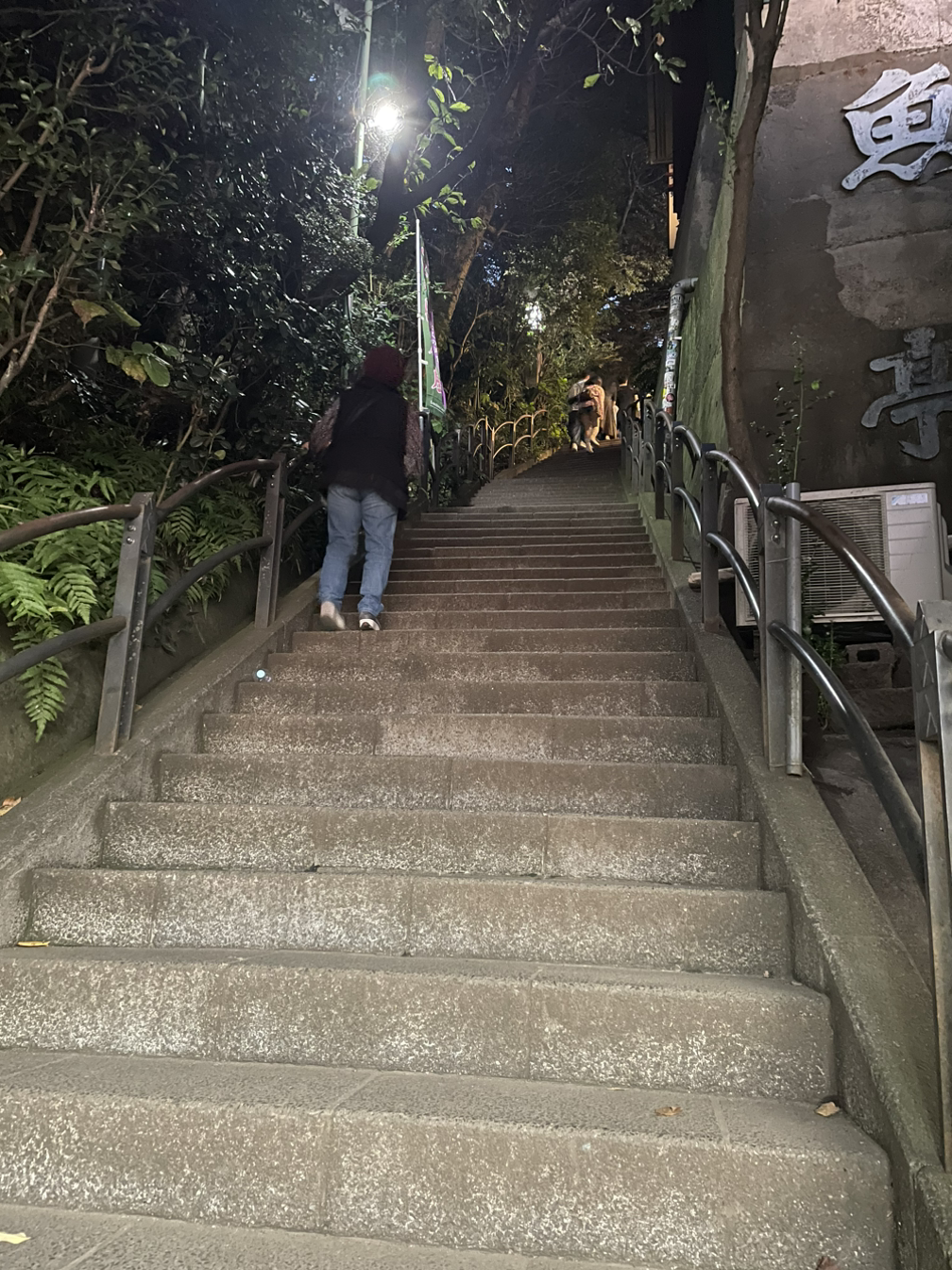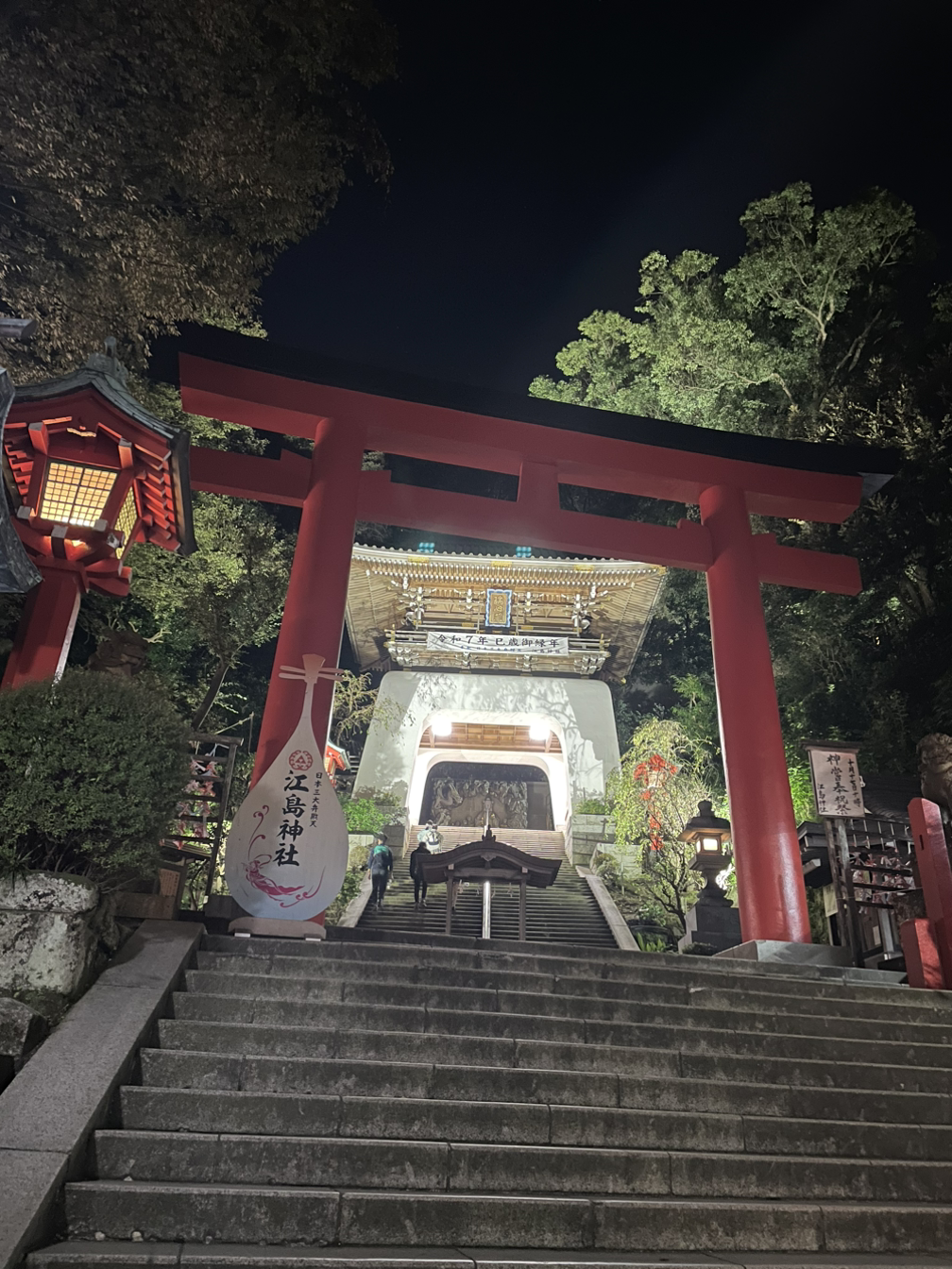 넘어가는 해와 함께 어둠이 내리는 계단 길을 숨을 고르며 천천히 오르내렸다. 에노시마 꼭대기에 있는 캔들 전망대 앞 정원에서 우리가 들어갈 차례가 될 때까지 앉아 쉬었다.