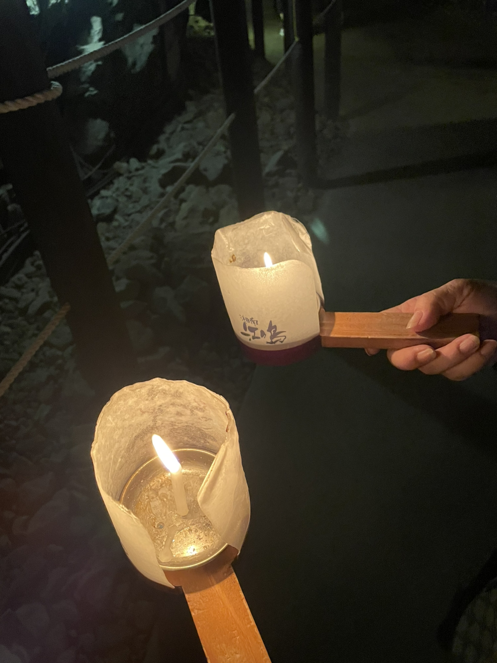 20여분 가량 걸어 에노시마 입구에 다다랐다. 엄마는 다 온 줄 아셨지만 실은 거기서부터 시작이었다. 에스컬레이터 탑승권과 전망대 입장권을 사면서 ‘이와야(岩屋) 동굴‘도 들어갈 수 있느냐고 안내원에게 물었더니 5시가 입장마감이지만 서둘러 가면 들어갈 수 있을 거라 했다. 시계를 보니 4시 30분이었다. 전에 한번 다녀온 터라 그 길을 엄마가 가실 수 있을까 살짝 걱정이 되었으나 엄마를 이끌고 질주하듯 사람들 사이를 헤쳐나갔다. 에스컬레이터를 3번 타고 가파른 계단들을 오르락내리락하며 이와야 동굴 입구에 도착하니 5시 5분 전이었다! 땀으로 젖은 몸에 가뿐 숨을 몰아쉬며 벌겋게 상기된 얼굴로 엄마를 돌아보며 새삼 엄마의 건강함에 감사했다. 입장 시간을 통과했으니 30분가량 두 개의 동굴을 둘러볼 수 있게 되었다.